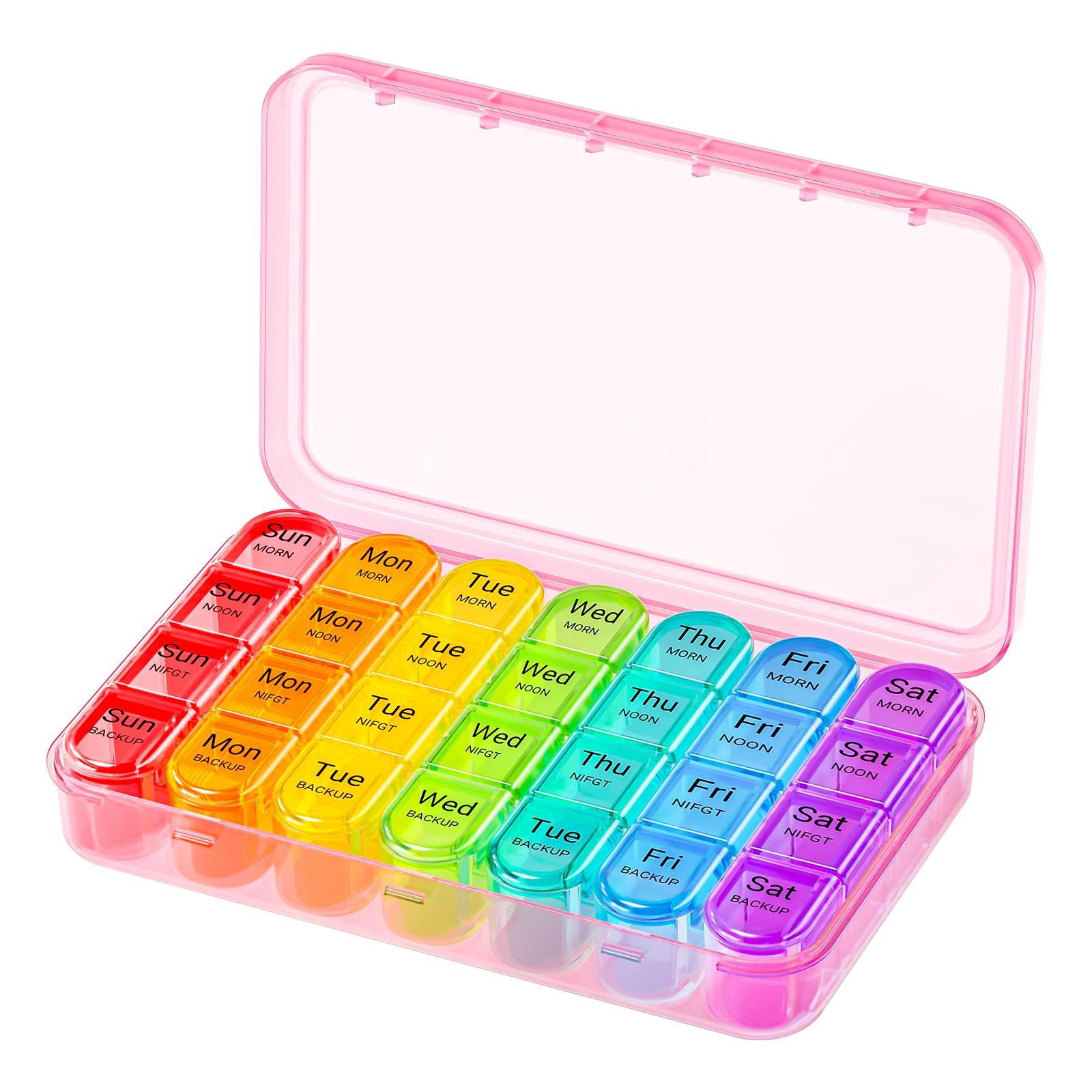 Pill Box 4 Times a Day 7 Days Pill Organiser Box with 28 Compartments Weekly Pill Case for Morning Noon Evening and Bed Time (Pink)