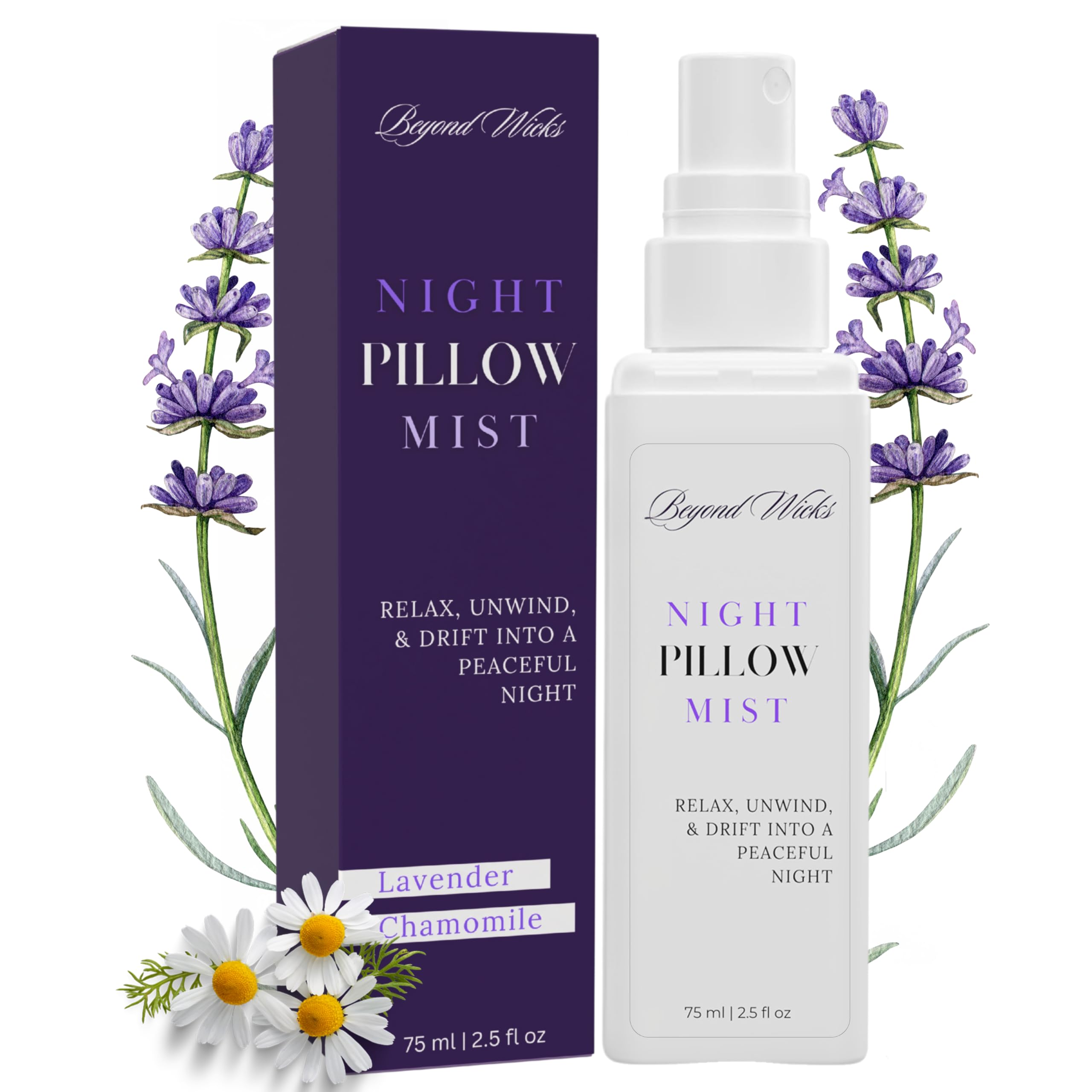 Lavender Essential Oil Pillow Mist by Beyond Wicks – A gentle pillow mist made with calming lavender and chamomile. This works well with your nightly routine with a soft, relaxing scent. Travel Essential Pillow Mist in 75ml (2.5 fl oz) Bottle – Conveniently sized lavender spray for sleep for nightstands, travel bags, or gifting. Ideal lavender bed spray for refreshing your space with a familiar scent while away from home. Essential Oil Aromatherapy Pillow Spray – A light fragrance mist made with lavender and chamomile essential oils. Spray onto pillows or into the air to add a soothing scent to your pillow spray for sleeping. Linen Spray for Pillows and Sheets – Use this lavender pillow spray for sleeping on linens pillows and sheets to complement a deep sleep routine. This lavender sleep spray for pillows works as a linen or bed spray to create a calming evening atmosphere. Lavender Chamomile Pillow Spray for Sleeping – This pillow spray combines lavender and chamomile essential oils to help refresh pillows and linens with a calming floral scent, ideal for nighttime use.