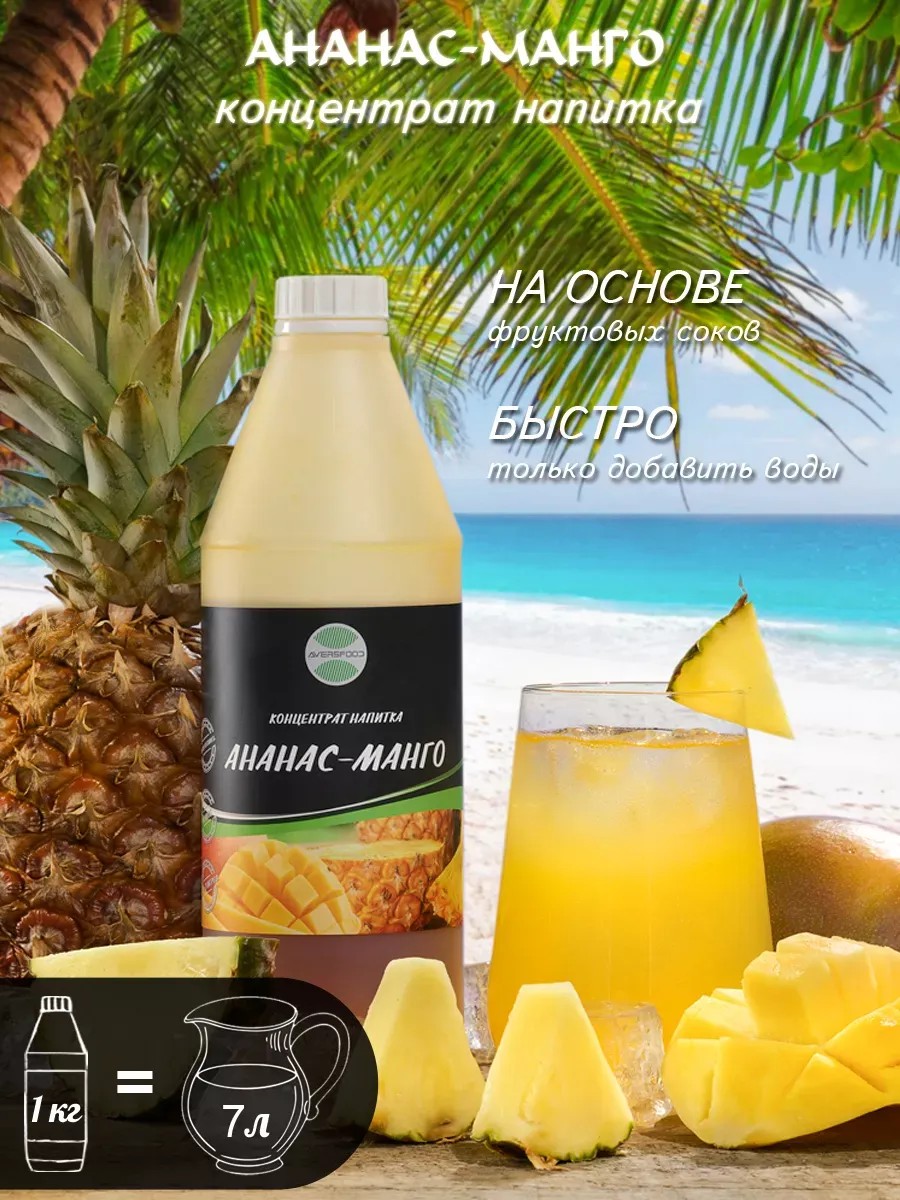 Pineapple Mango Drink Base Concentrate, 1 kg. Convenient and quick! Simply dilute the drink concentrate with water or add it to tea, cocktails, lemonade, smoothies, or as a syrup for dessert, pancakes, fritters, or ice cream. One bottle of concentrate yields up to 7 liters of delicious ready-to-drink drink. Made with natural ingredients—pineapple juice, mango juice, and lemon juice—it's perfect any time of year, hot or cold. IMPORTANT: The concentrate is poured only up to the top of the bottle; the product weighs 1 kg. Our drink is searched for by the following queries: Concentrate, Drink concentrate, Pineapple, Mango, Pineapple Mango, Drink base, Juice, Natural products, Food products, Syrup, Tea additive, Pineapple tea, Pineapple tea, Pineapple syrup, Pineapple syrup, Pineapple drink, Pineapple drink, Mango tea, Mango tea, Mango syrup, Mango syrup, Mango drink, Mango drink, Tea with mango, Tropical tea, Syrup for lemonade, Syrup for coffee, Syrup for tea, Delicious gift, Products, Healthy products, Citrus fruits, Orange juice, Grapefruit juice, Tropical juice, Multifruit, Lemonade, Base for lemonade, carbonated drinks, drink syrup, lemonade syrup, water syrup, drinks from Russia.