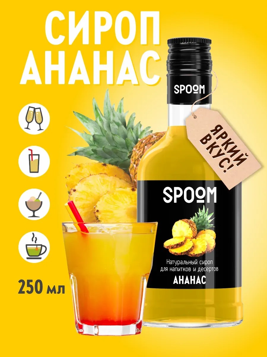Сироп Spoom Ананас имеет сочный и освежающий вкус. Идеально подходит для создания самых разных коктейлей, лимонадов, смузи, холодного чая, а также для десертов, тортов и пирожных. Вкус спелого ананаса придаст вашему блюду яркий тропический акцент.