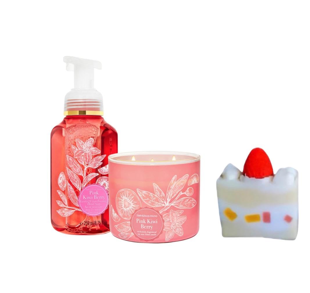 PINK KIWI BERRY - White BarnBath Body Work- 3-Wick Scented Candle 14.5 OZ Burns 25-45 Hours and Gentle Foaming Hand Soap 8.75 Ounce WITH Strawberry Cake soap (Label Artwork Varies)