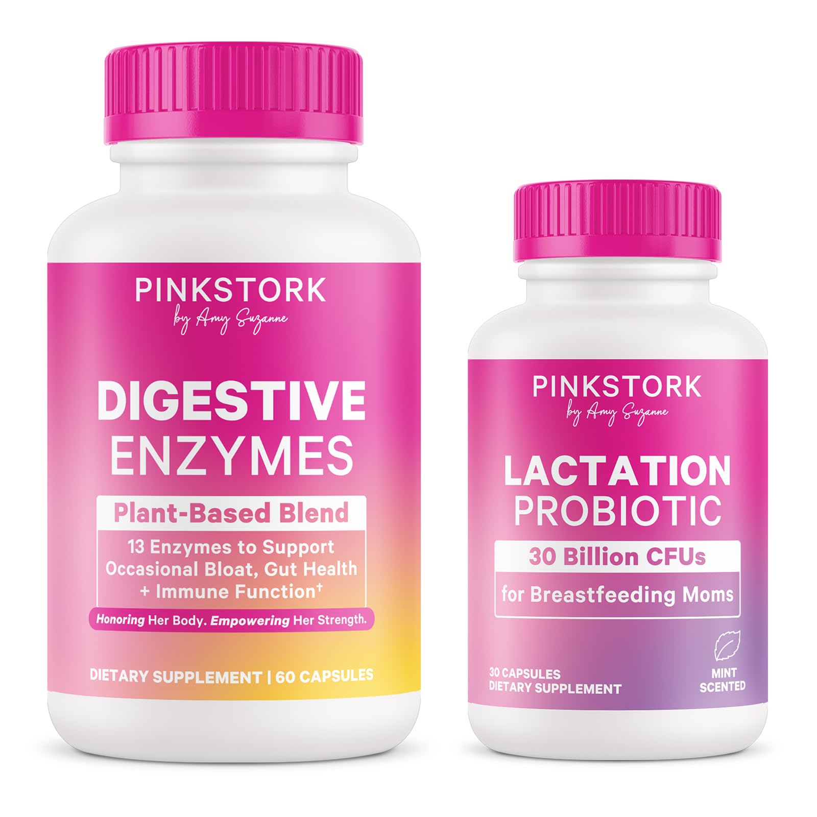 Support postpartum digestion and gut balance with Pink Stork Digestive Enzymes (13 plant-based enzymes to support natural food breakdown and nutrient absorption) plus Lactation Probiotic, Mint (probiotics to support digestive, gut, and immune health for breastfeeding moms).EXPERT FORMULATED, WOMEN-OWNED – MADE BY WOMEN, FOR WOMEN: Pink Stork products are developed by a team of female experts and rigorously tested for quality and effectiveness. Founded by Integrative Nutrition Health Coach Amy Suzanne, Pink Stork is women-owned and women-run, dedicated to supporting women's wellness through every life stage - from pregnancy and postpartum to hormonal balance, mood changes, and daily stress management. CLEAN, TESTED BREASTFEEDING-FRIENDLY QUALITY: Made without GMOs, gluten, wheat, dairy, soy, or artificial ingredients. Lactation Probiotic is third-party tested for purity and potency, giving nursing and pumping moms confidence in clean, thoughtfully crafted support. ENZYMES PROBIOTICS FOR POSTPARTUM DIGESTIVE SUPPORT: Enzymes help support the natural breakdown of food for digestion and nutrient absorption, while probiotics help balance gut bacteria to support digestion, microbiome health, and immune function. A supportive daily combo for breastfeeding moms navigating postpartum digestion and hormonal changes. LACTATION PROBIOTIC – DIGESTIVE, GUT IMMUNE SUPPORT FOR BREASTFEEDING MOMS: Pink Stork Total Lactation Probiotic supports gut health, digestive wellness, vaginal pH balance, immune health, and overall postpartum wellness. Designed for nursing and pumping moms, just 1 mint,scented capsule daily fits easily into your postnatal routine. DIGESTIVE ENZYMES FOR WOMEN – 13 PLANT-BASED ENZYMES FOR COMFORTABLE DIGESTION: Not a fiber supplement - this full-spectrum blend of 13 vegan enzymes supports the natural breakdown of proteins, fats, carbs, dairy, and fiber to promote comfortable digestion and nutrient absorption. Thoughtfully formulated for women with sensitive stomachs, including during hormonal shifts like postpartum.