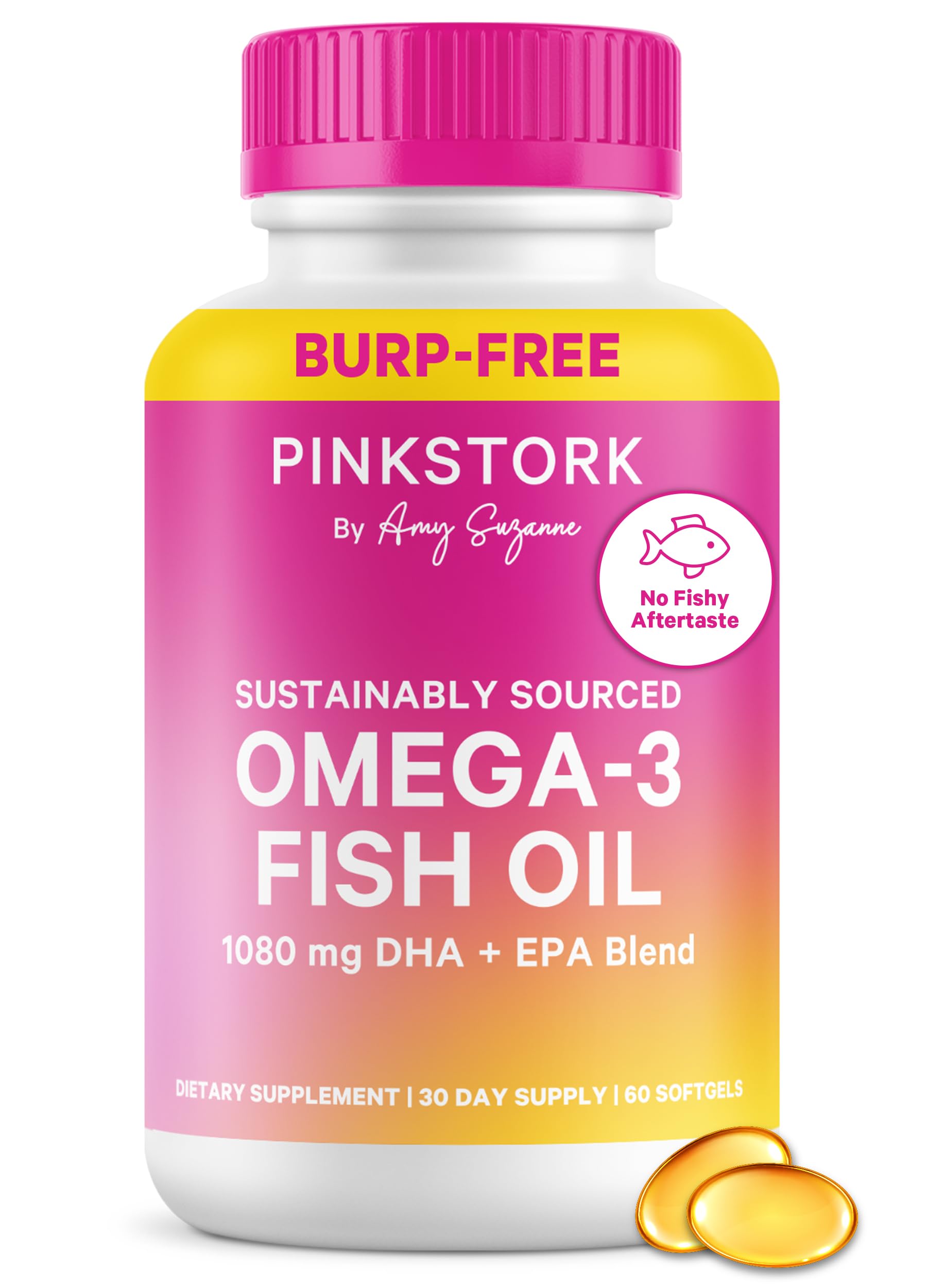 Women-Owned, Women-Run: Founded by Amy Suzanne, Pink Stork empowers women through every stage of life with scientifically backed products, trusted supplements, and a supportive community. Our mission is to inspire, encourage, and strengthen women, guided by compassion. With a focus on holistic wellness, we provide high-quality solutions designed to help you feel your best, offering unwavering support as you embark on your unique journey. CLEAN TRUSTED: Our non-GMO, high EPA DHA Omega 3 supplement is sourced purely from clean, wild caught fish from Friend of the Sea certified sustainable fisheries. Each Pink Stork product is cGMP-certified and third-party tested for quality - ensuring you get only the best for your health!. COGNITIVE FUNCTION BRAIN STRUCTURE: A high-quality omega 3 supplement for women is critical for cognition, memory, and learning. DHA is a major structural component of the brain, and adequate levels are essential for maintaining healthy brain function and structure. EXPERTS AGREE: At 1080 mg per dose our formula meets the daily recommended dose suggested by the American Heart Association to support a healthy heart. NO FISHY AFTERTASTE: Pink Stork Fish Oil Omega 3 supplements are purified and concentrated in premium burpless softgels - and each bottle features a berry-scented scentcert, so your supplements smell and taste as great at they make you feel. Enjoy alongside Pink Stork's women wellness line for ultimate health, including our Women's Multivitamin, Magnesium Glycinate, and Probiotics for Womenll. DHA EPA: Pink Stork Omega 3 Fish Oil features two vital omega 3 fatty acid supplements - 650 mg DHA and 260 mg EPA from sustainably sourced fish. Add to your wellness ritual to support brain, eye, and mood health take 2 softgels daily for optimum wellness.