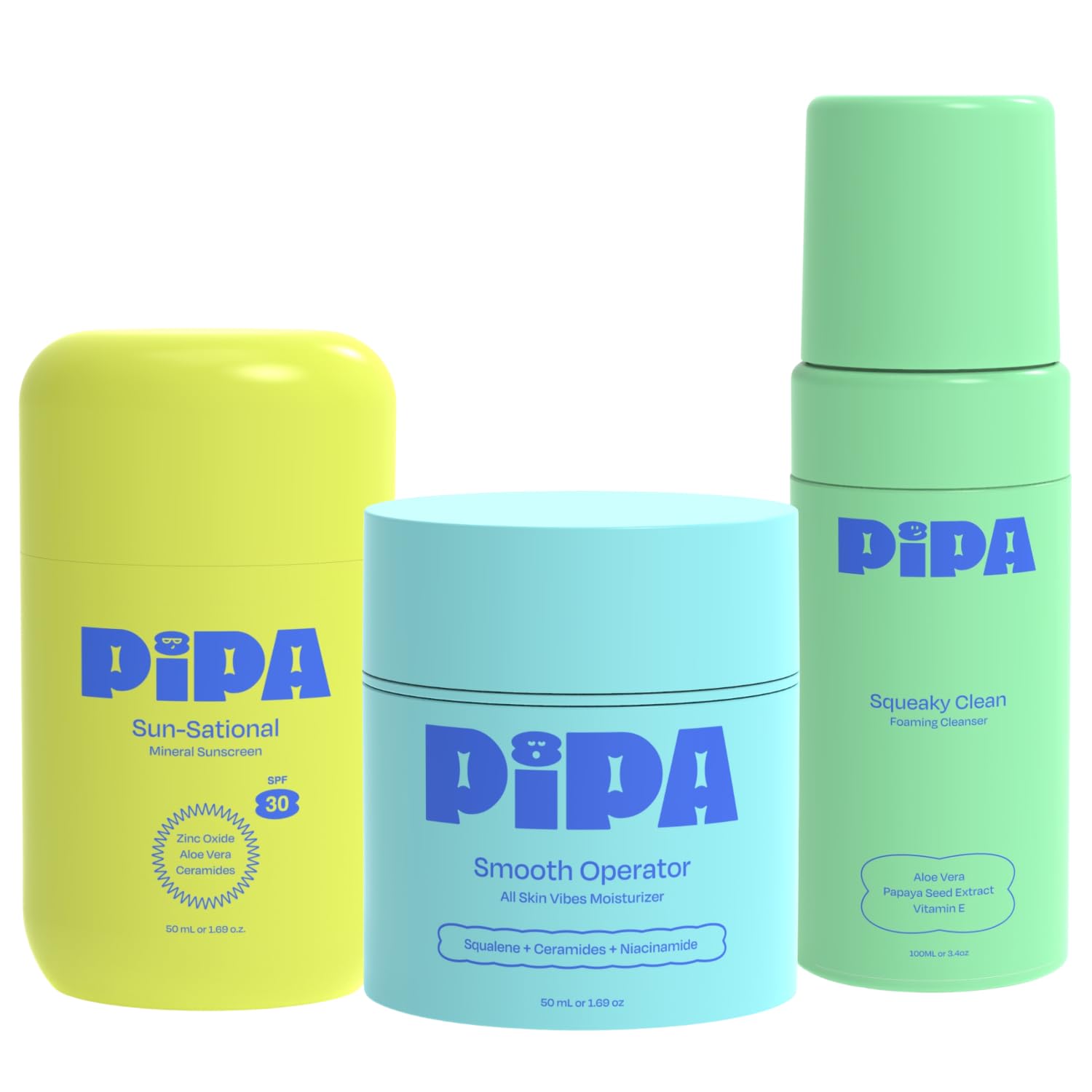 Pipa Skincare Daily 1-2-3 Routine Set: Clean Skincare for Growing Skin Introduce your child to healthy skincare habits with the Pipa Skincare Daily 1-2-3 Routine Set! This clean skincare bundle is perfectly designed for kids and tweens, offering a simple yet effective daily regimen to keep young skin clean, hydrated, and protected. Crafted with gentle, nourishing ingredients, our Hydrating Nourishing Tween Skincare Set makes skincare fun and easy. Each set includes: Foaming Face Wash: A gentle, purifying cleanser that effectively removes dirt, oil, and impurities without stripping natural moisture, leaving skin feeling fresh and clean. Face Moisturizer: A lightweight, hydrating moisturizer that replenishes essential moisture, keeping young skin soft, smooth, and balanced throughout the day. SPF 30 Mineral Sunscreen: Our broad-spectrum mineral sunscreen provides essential daily protection against UVA UVB rays with non-nano zinc oxide, blending seamlessly without a white cast. The Pipa Skincare Daily 1-2-3 Routine Set is free from harsh chemicals, fragrances, and dyes, making it ideal for sensitive skin. Establish a foundation for lifelong healthy skin with this essential, easy-to-follow routine.Science-Backed, Mom-Approved Skincare: Proudly made in the USA with high-quality ingredients. Pipa Skincare empowers modern parents with safe, effective products that nurture a strong generational bond through clean skincare. Pediatrician Dermatologist Approved: Made with clean, non-toxic ingredients and free from parabens, sulfates, and artificial fragrances. Expert-approved for safe, daily use on young skin. 100 Mineral SPF 30 Sunscreen: Lightweight, non-greasy sunscreen made with 100 mineral filters for broad-spectrum SPF 30 protection. Absorbs easily and blends in clear—no white cast, no fuss. Smooth Operator: A silky, lightweight moisturizer that deeply hydrates and calms young, sensitive skin without clogging pores or feeling greasy. Gentle Daily Face Cleanser for Kids Tweens: Designed for young, developing skin, this mild face wash removes dirt, oil, and impurities without stripping natural moisture. A perfect first step in building a healthy skincare routine for tweens and early teens.