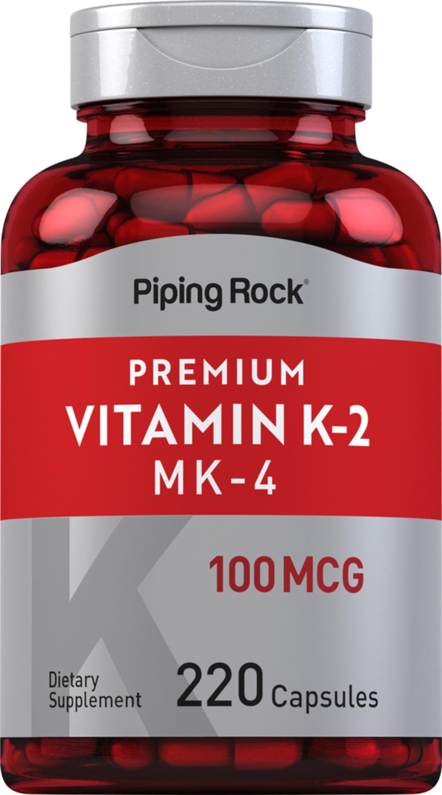 Piping Rock Vitamin K2 MK-4 delivers 100 mcg of Vitamin K-2 (as Menaquinone-4 or MK-4) in quick release capsules. We make it easy for you to enjoy the benefits of this important vitamin. Plus, our formula is gluten free and non-GMO, delivering the exceptional quality men and women deserve. Enjoy our 220-count supply now!