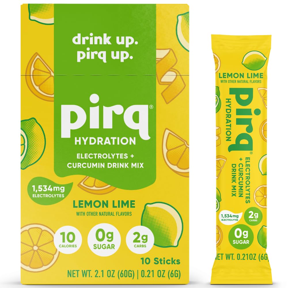 Pirq Hydration - Lemon Lime - Hydration Powder Packets Electrolyte Drink Mix Curcumin B Vitamins Zero Sugar Keto Friendly 10 SticksZERO SUGAR, LOW CARB: Pirq Hydration is perfect for anyone interested in a keto, low-carb or intermittent fasting lifestyle, and a gluten-free diet. Each packet is less than 10 calories, zero sugar, 1 carb. B vitamins: Your energy squad! Vitamins B3, B5, and B12 support brain health, boost energy, and support healthy skin and hair. On-the-go hydration: Enjoy convenient, on-the-go hydration with Pirq Hydration. These single-serving, travel-friendly stick packets are perfect for taking to the gym, sports games, and long flights. Pour 1 stick pack into 16 oz of water, shake or stir thoroughly, and let the tasty hydration party begin!. Non-GMO: Pirq Hydration Electrolyte Powder Drink Mix with Curcumin is made with natural flavors and has no artificial colors, sweeteners, or ingredients. Every serving contains 5 essential electrolytes, vitamins B3, B5, B12, vitamin E, and turmeric's golden superpower curcumin. It's also gluten-free, soy-free, and dairy-free. Pirq Hydration: A party for your taste buds and a boost for your body. Whether you're hitting the gym, off to an adventure, or simply conquering everyday challenges, Pirq hydration mix is a faster and tastier way to hydrate, recover, and replenish than water alone. Packed with 5 essential electrolytes, B vitamins, and turmeric's superpower curcumin, our hydration mix is like a high-five for your cells to keep them going strong all day, every day.