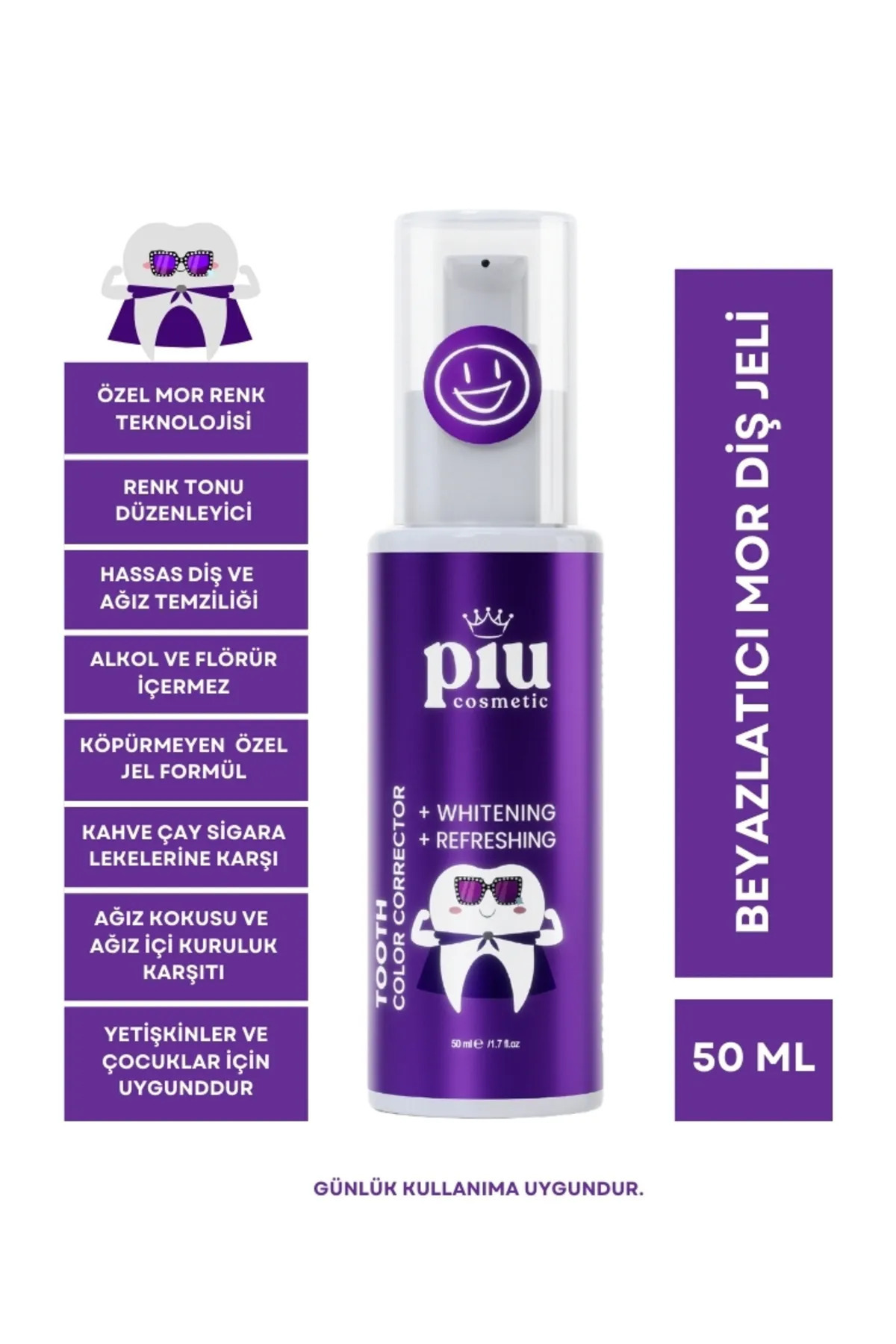 Piu Cosmetic'in Mor Dis Beyazlatici Jeli, beyazlatici etki sunan ve sari tonlarin tamamen ortadan kalkmasina yardimci olan özel bir agiz bakim ürünüdür. Benzersiz formülasyonu ve suya çözünebilen Mor Renk Teknolojisi ile dislerdeki sari renklerin nötralize edilmesini saglar. Kahve, çay ve sigara lekelerine karsi etkili bakim sunarak daha beyaz ve parlak dislere kavusmaniza yardimci olur. Dis macunu yerine sadece bunu kullanabilirsiniz.