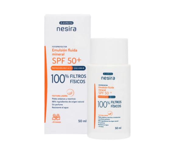 Acofarma Nesira Mineral Fluid Sunscreen SPF50 50ml is a high-protection sunscreen formulated with physical filters that reflect and scatter sunlight, preventing its penetration into the skin. This emulsion is suitable for all skin types, especially atopic, sensitive, reactive, or intolerant skin, as well as for those with very fair skin. INGREDIENTS Zinc Oxide, Dicaprylyl Carbonate, Aqua (Water), Caprylic Capric Triglyceride, Titanium Dioxide, Helianthus Annuus (Sunflower) Seed Oil, Polyglyceryl-2 Dipolyhydroxystearate, Polyglyceryl-3 Diisostearate, Polyhydroxystearic Acid, Sodium Chloride, Silica, Joji. oba esters, Pentent Ylene Glycol, Glyceryl Caprylate, Tocopherol, Tetrasodium Glutamate Diacetate, Magnolia Officinalis Bark Extract, Phytic Acid.Convenient 50ml size – ideal for carrying in your handbag or backpack and for easy application. Shake before use and apply generously before sun exposure. Reapply frequently to maintain protection. Natural and soothing ingredients – enriched with sunflower oil, antioxidants, and natural emulsifiers. Silicone-free, paraben-free, and free of harsh fragrances, for daily skin protection. Suitable for babies, children, and adults – safe formula from 6 months of age during indirect sun exposure. Perfect for the whole family, especially for skin that is reactive or intolerant to chemical filters. Fluid, lightweight texture with no white cast – its fast-absorbing formula leaves no residue or greasy feeling, providing a silky-smooth, matte finish ideal even for sensitive or atopic skin. Broad-spectrum mineral SPF50 photoprotection - With 100 mineral physical filters (zinc oxide and titanium dioxide), this emulsion effectively protects against UVA, UVB and infrared rays, reflecting solar radiation instead of absorbing it.PIUMER ACOF. NESIRA Émulsion liquide solaire minérale SPF50 50 mlDESCRIPTION DU PRODUIT DESCRIPTION DU PRODUIT L'émulsion fluide solaire minérale SPF50 50 ml d'Acofarma Nesira est un écran solaire haute protection formulé avec des filtres physiques qui réfléchissent et dispersent les rayons solaires, empêchant leur pénétration dans la peau. Cette émulsion convient à tous les types de peau, en particulier celles atopiques, sensibles, réactives ou intolérantes aux filtres chimiques, ainsi qu'aux personnes à la peau très claire. INGRÉDIENTS Zinc Oxide, Dicaprylyl Carbonate, Aqua (Water), Caprylic Capric Triglyceride, Titanium Dioxide, Helianthus annuus (Sunflower) SeeD OIL, Polyglyceryl-2 DipolyhydroxySTEARATE, Polyglyceryl-3 Diisostearate, Polyhydroxystearic Acid, Sodium Chloride, Silica, Jojji. oba esters,pentent Ylene Glycol, Glyceryl Caprylate, Tocopherol, Tetrasodium Glutamate Diacetate, Magnolia Officinalis Bark Extract, Phytic Acid.Format pratique de 50 ml - Idéal pour transporter dans votre sac à main ou sac à dos et appliquer facilement. Agiter avant utilisation et appliquer généreusement avant l'exposition. Répétez fréquemment pour maintenir la protection. Ingrédients naturels et apaisants - Enrichi en huile de tournesol, antioxydants et émulsifiants naturels. Sans silicone, sans paraben et sans parfum agressif, pour un soin dermoprotecteur quotidien. Convient pour les bébés, les enfants et les adultes - Formulation sûre dès l'âge de 6 mois lors d'expositions indirectes. Parfait pour toute la famille, en particulier pour les peaux réactives ou intolérantes aux filtres chimiques. Texture fluide, légère et sans effet blanc - Sa formule à absorption rapide ne laisse pas de résidus, pas de sensation grasse, offrant un fini mat et soyeux idéal même pour les peaux sensibles ou atopiques. Photoprotection minérale SPF50 à large spectre - Avec des filtres physiques 100 minéraux (oxyde de zinc et dioxyde de titane), cette émulsion protège efficacement contre les rayons UVA, UVB et infrarouges, reflétant le rayonnement solaire au lieu de l'absorber.