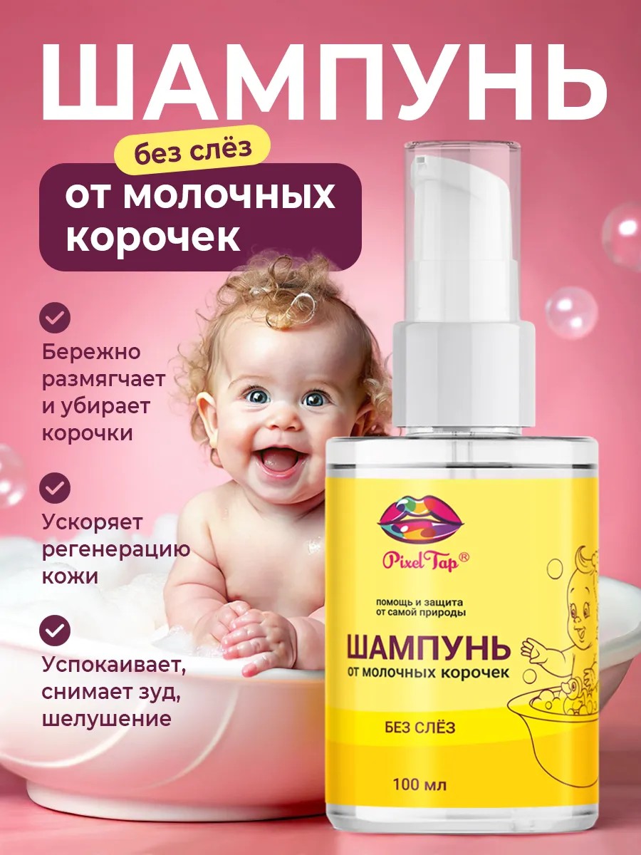 Детский шампунь для новорожденных от молочных корочек бренда PixelTap создан для самых маленьких детей с рождения. Органический эко состав с натуральным ланолином, экстрактом ромашки, алоэ и Д пантенолом обладает смягчающим, увлажняющим и заживляющим свойством. Гипоаллергенное средство без слез гарантирует мягкое очищение кожи головы и волос и легкое расчесывание. Эффективно устраняет сухие себорейные корочки. Не содержит искусственных красителей, силиконов и парабенов, pH нейтральный. Для ухода за чувствительной кожей грудничков 0+. Упаковка в форме флакона с дозатором 100 мл. обеспечивает комфортное применение. Нанести babe шампунь на влажные волосы ребенка, помассировать, оставить пенку для воздействия на несколько минут, смыть водой. Можно использовать для купания младенцев девочек и мальчиков с 0 месяцев. Одобрен дерматологами и педиатрами. Шампуньдетский масляный от сухости и шелушения хороший подарок для мам и малышей для сумки на выписку в роддом. У нас есть акции и распродажи, можно купить наши товары со скидкой по выгодной цене любимой, маме, подруге.