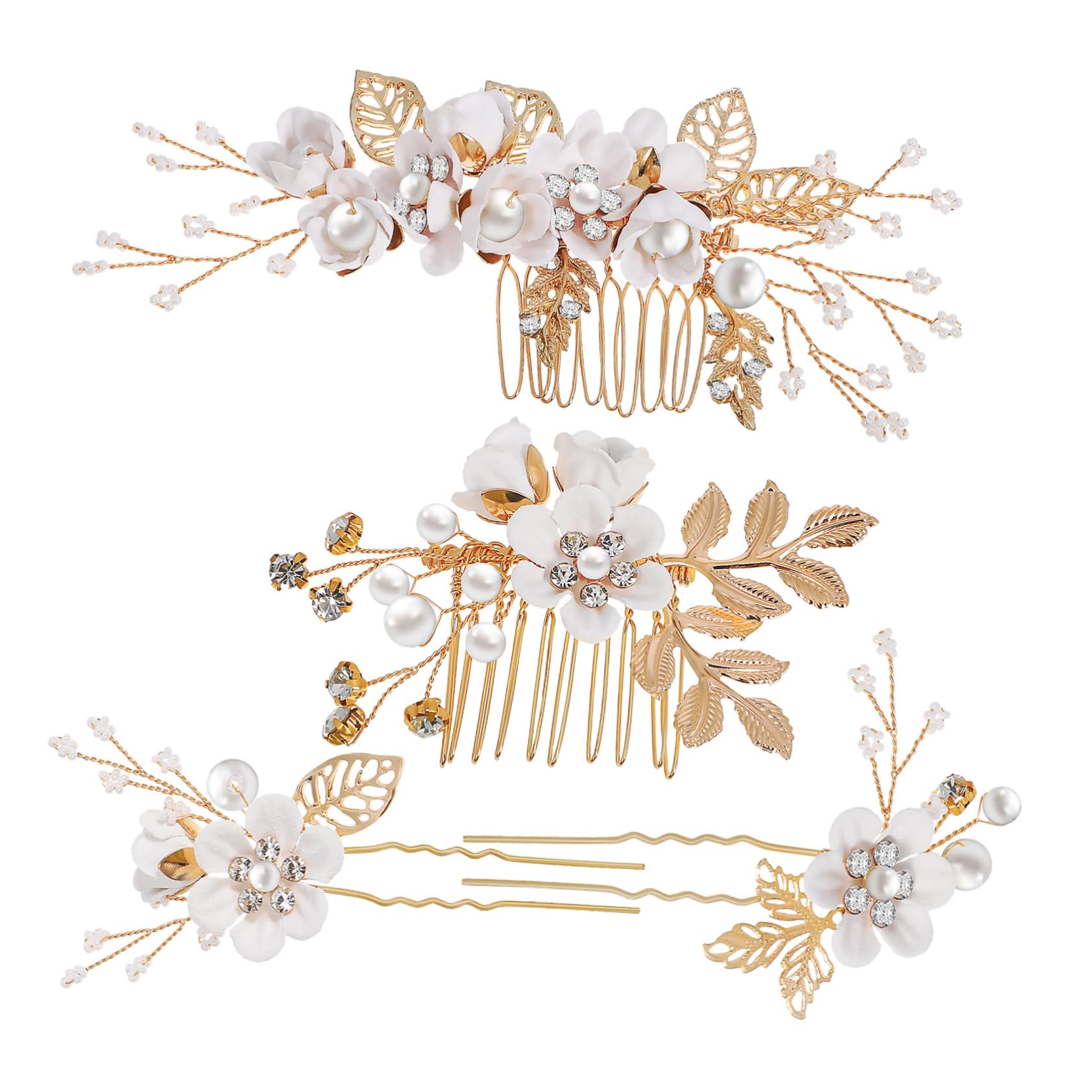 Wedding hair accessory-- secure hold: designed to stay in place without compromising comfort, the flower side combs and hair pins keep your hair perfectly styled throughout the event,bride side combs. Rhinestones wedding hair clip-- luxurious embellishing: the embellishments of artificial pearls and shimmering rhinestones bring a refined charm onto the floral hair accessories,hair decorations. Wedding hair pin-- multipurpose elegance: be it weddings, prom nights, parties, or simply enhancing your daily wearing, these versatile flower hair decors infuse an aura of grace,pearl hair barrette. Bride headdress-- steady yet comfortable: designed to firmly anchor in place without causing discomfort, flower side combs and u shaped hairpins make a stable hairdo,hair flowers. Rhinestones wedding side comb-- fashion statements: offering versatile styling options, whether wearing singly or as a cohesive set, these floral hair accessories flawlessly harmonize with diverse hairstyles,bridal hair side comb.