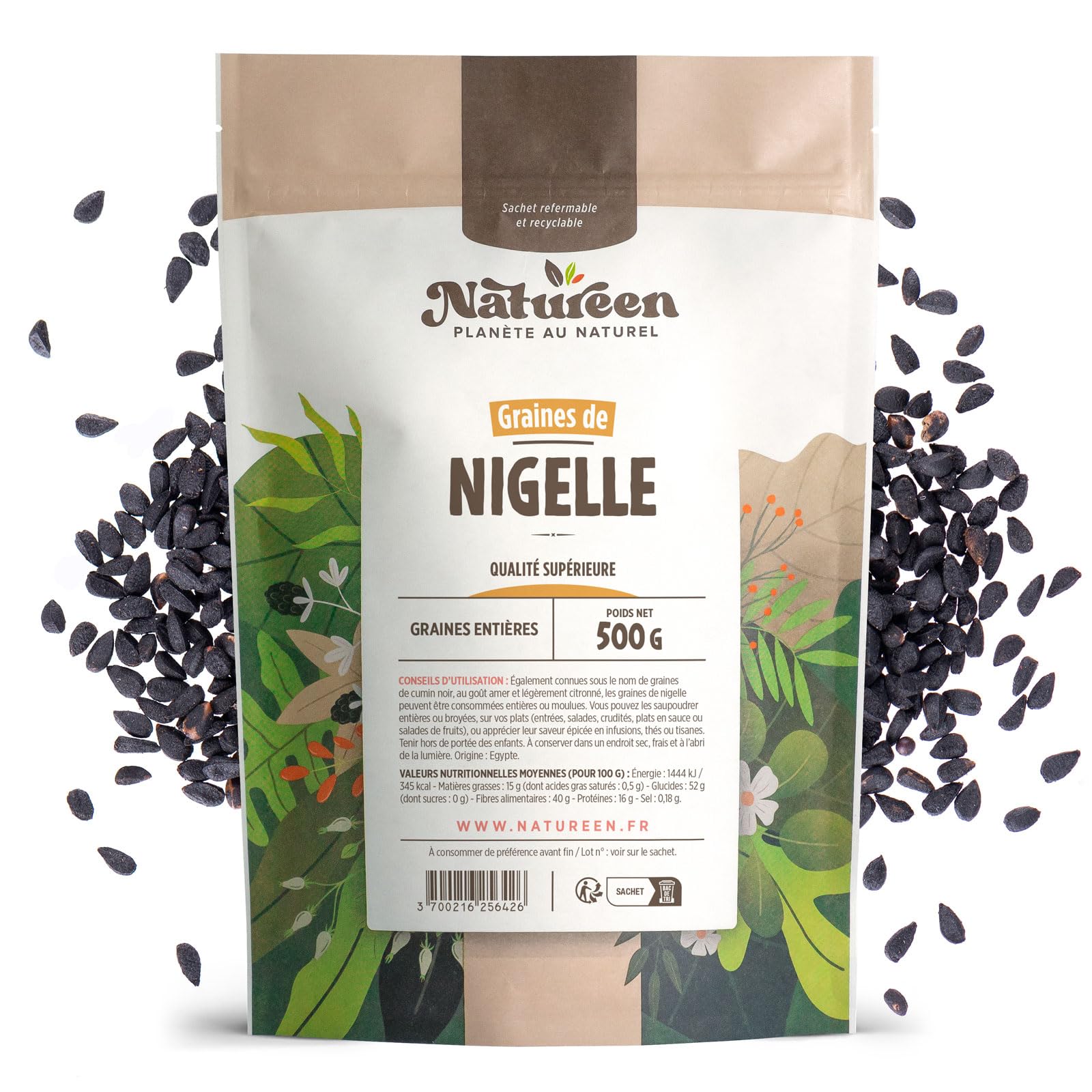 Nigella are annual herbaceous plants with finely cut leaves, belonging to the Ranunculaceae family and the genus Nigella (from the Latin "nigella," itself derived from "niger," meaning black, in reference to the color of the seeds of species in this genus). There are about twenty species, all native to Eurasia. Some were once consumed, either as seeds or as spices, and some still are in certain Eastern countries, or cultivated as ornamental plants. INGREDIENTS 500g of Nigella seeds. AVERAGE NUTRITIONAL VALUES (PER 100 G): Energy: 1444 kJ 345 kcal - Fat: 15 g (of which saturates: 0.5 g) - Carbohydrate: 52 g (of which sugars: 0 g) - Fiber: 40 g - Protein: 16 g - Salt: 0.18 g. INSTRUCTIONS FOR USE Also known as black cumin seeds. Nigella seeds have a bitter, slightly lemony taste. Ground whole seeds can be used by sprinkling them over dishes (appetizers, salads, raw vegetables, stews, or fruit salads), or in teas, herbal teas, and infusions. Consume as part of a balanced diet. See moreGraine de Nigelle 500 gr 500 g (Lot de 1)DESCRIPTION DU PRODUIT DESCRIPTION DU PRODUIT Les nigelles sont des plantes herbacées annuelles au feuillage finement découpé de la famille des Renonculacées, appartenant au genre Nigella (du latin « nigella » lui-même de « niger » signifiant noir en référence à la couleur des graines des espèces de ce genre). Il en existe une vingtaine d'espèces, toutes originaires d'Eurasie. Certaines étaient autrefois consommées, en graines ou comme épices, ou le sont encore dans certains pays d'Orient ou cultivées comme espèces ornementales. INGRÉDIENTS 500g de graines de Nigelle. VALEURS NUTRITIONNELLES MOYENNES (POUR 100 G) : Énergie : 1444 kJ 345 kcal - Matières grasses : 15 g (dont acides gras saturés : 0,5 g) - Glucides : 52 g (dont sucres : 0 g) - Fibres alimentaires : 40 g - Protéines : 16 g - Sel : 0,18 g. MODE D'EMPLOI Egalement connues sous le nom de graines de cumin noir. La graine de Nigelle a un gout amère et légèrement citronné. On peut utiliser les graines entières moulues en saupoudrant sur les plats (entrées, salades, crudités, plats en sauce ou salade de fruits), ou dans les thés, tisanes et infusion. A consommer dans le cadre d'une alimentation équilibrée. Voir plus