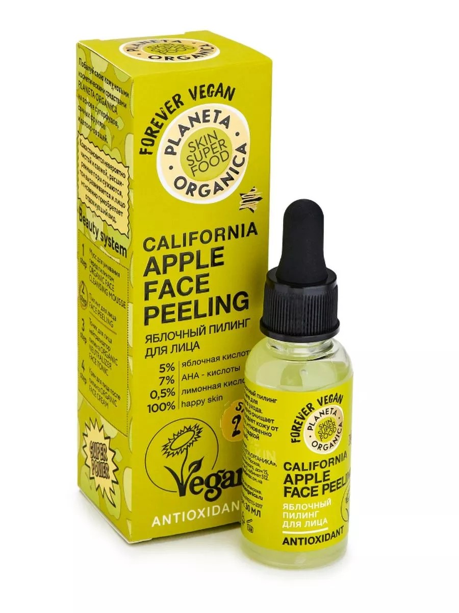 Planeta Organica Skin Super Food, Яблочный пилинг для лица 30 мл. Всего несколько минут на то, чтобы сделать кожу чистой, молодой и сказочно красивой! Этот яблочный пилинг - must-have для домашнего ухода за кожей. Эффективно очищает и освобождает кожу от токсинов, мгновенно делая ее гладкой и сияющей! Яблочная кислота из зеленых яблок – мощный природный антиоксидант, мгновенно улучшает тон и текстуру кожи, придавая тонус и свежесть. Фруктовые AHA - кислоты из киви глубоко очищают поры, обновляют и омолаживают кожу. Лимонная кислота сокращает пигментацию и выравнивает тон кожи, придавая естественное сияние. Кожа становится невероятно чистой и свежей, расширенные поры сужаются, тон выравнивается и лицо мгновенно приобретает отдохнувший вид.