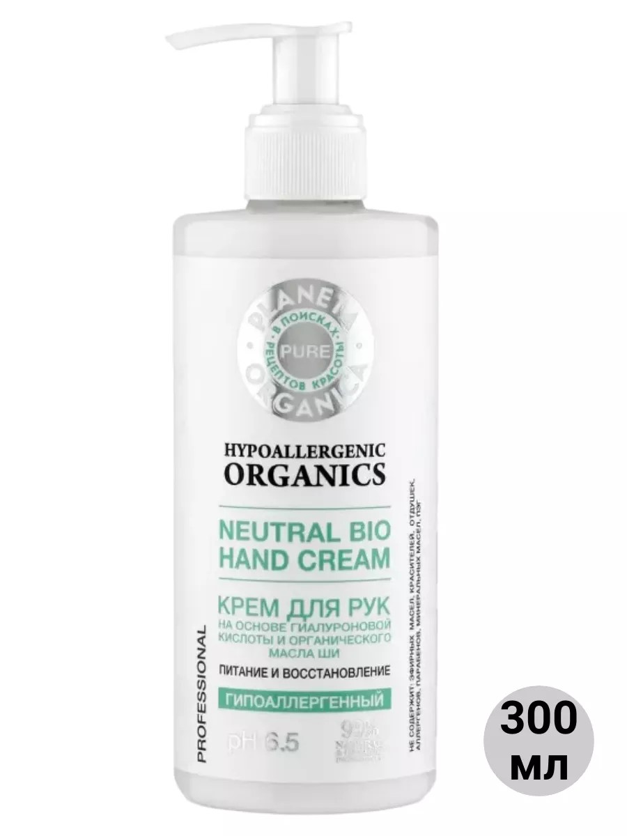 Planeta Organica PURE Hand Cream Nourishing and Restoring, 300 ml. The most gentle and safe cosmetic collection, created specifically for especially delicate care of the face, hair, and body. Ideal even for the most sensitive and allergy-prone skin. This hand cream is specially created for safe, gentle, and professional care of nails and hands. It is instantly absorbed, restores and nourishes the skin, strengthens nails, and softens cuticles. Ideal for sensitive and allergy-prone skin. Natural hypoallergenic ingredients protect the skin of the hands from negative environmental factors, cold, wind, and UV radiation. ACTIVE HYPOALLERGENIC INGREDIENTS: High-molecular hyaluronic acid deeply moisturizes and rejuvenates the skin of the hands. Organic shea butter protects and restores the skin. Organic mountain arnica oil nourishes and soothes the skin. Hypoallergenic, confirmed by the Institute of Siberian Cosmetics. Suitable for vegans. Not tested on animals.
