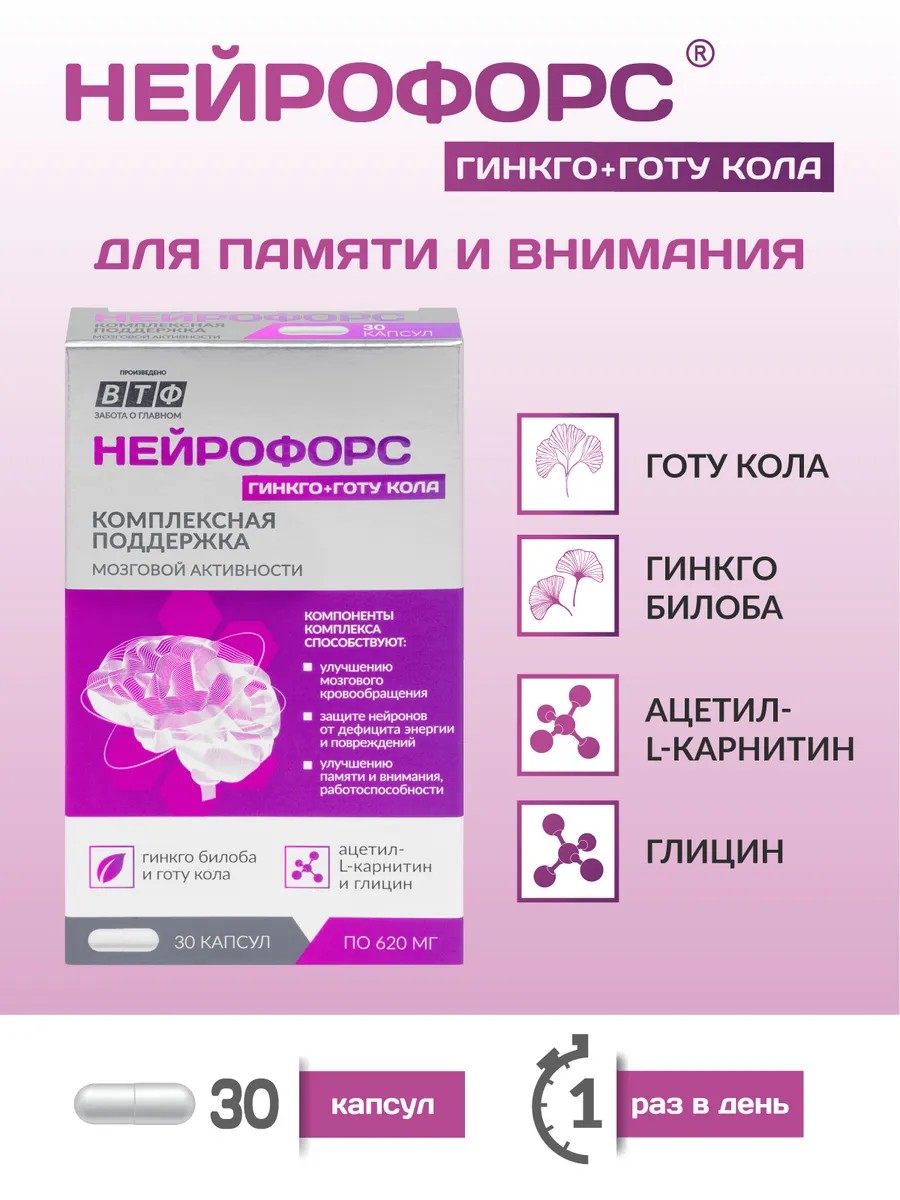 Сочетание натуральных экстрактов гинкго билоба, готу кола и аминокислот, обладающих ноотропным действием, для поддержки нервной системы, когнитивных функций и питания нейронов.
