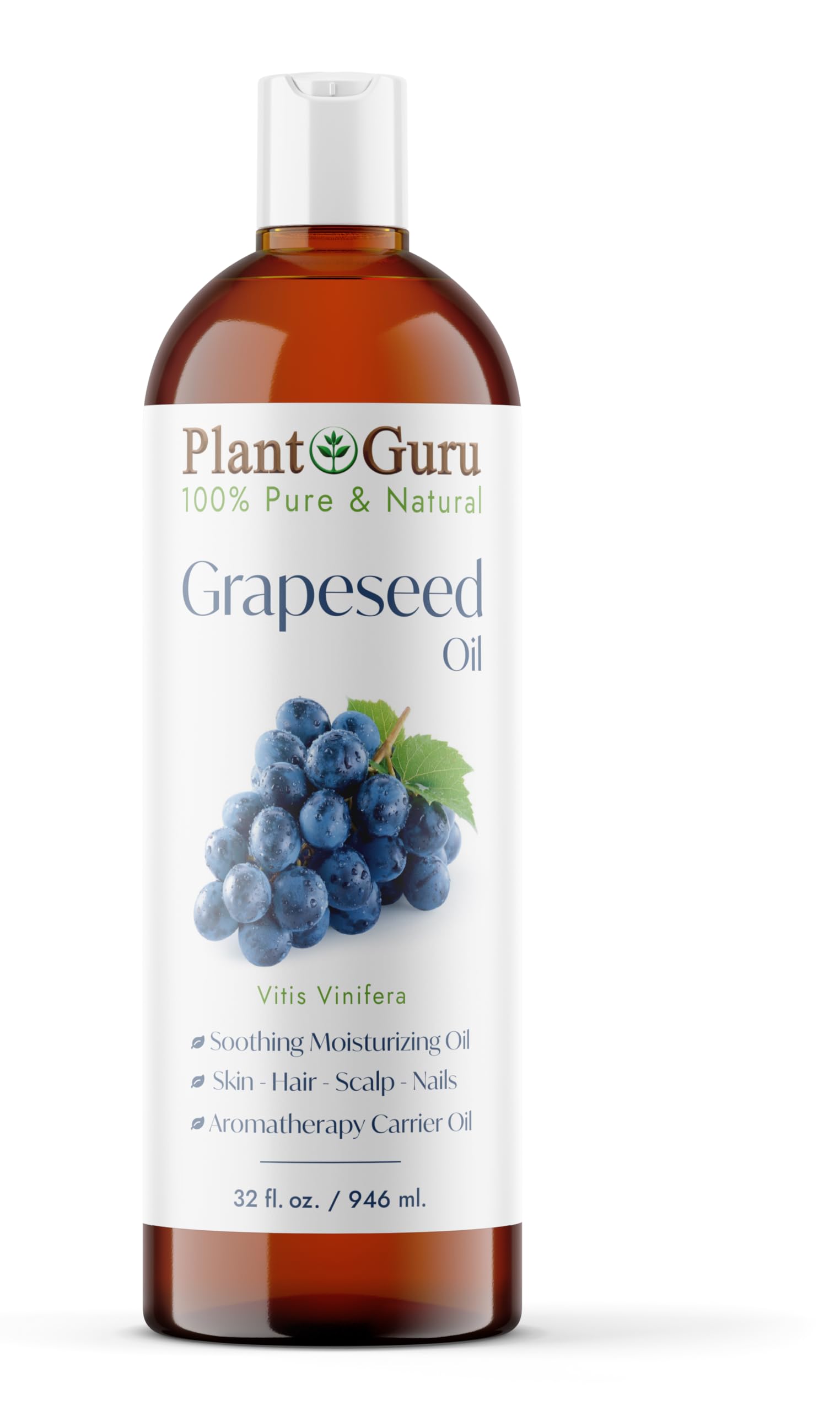 Plant Guru Grapeseed Oil 32 oz. Cold Pressed 100% Pure Natural Carrier For Skin Body Face and Hair Growth Moisturizer. Great For Creams Lotions Lip balm and Soap Making.
