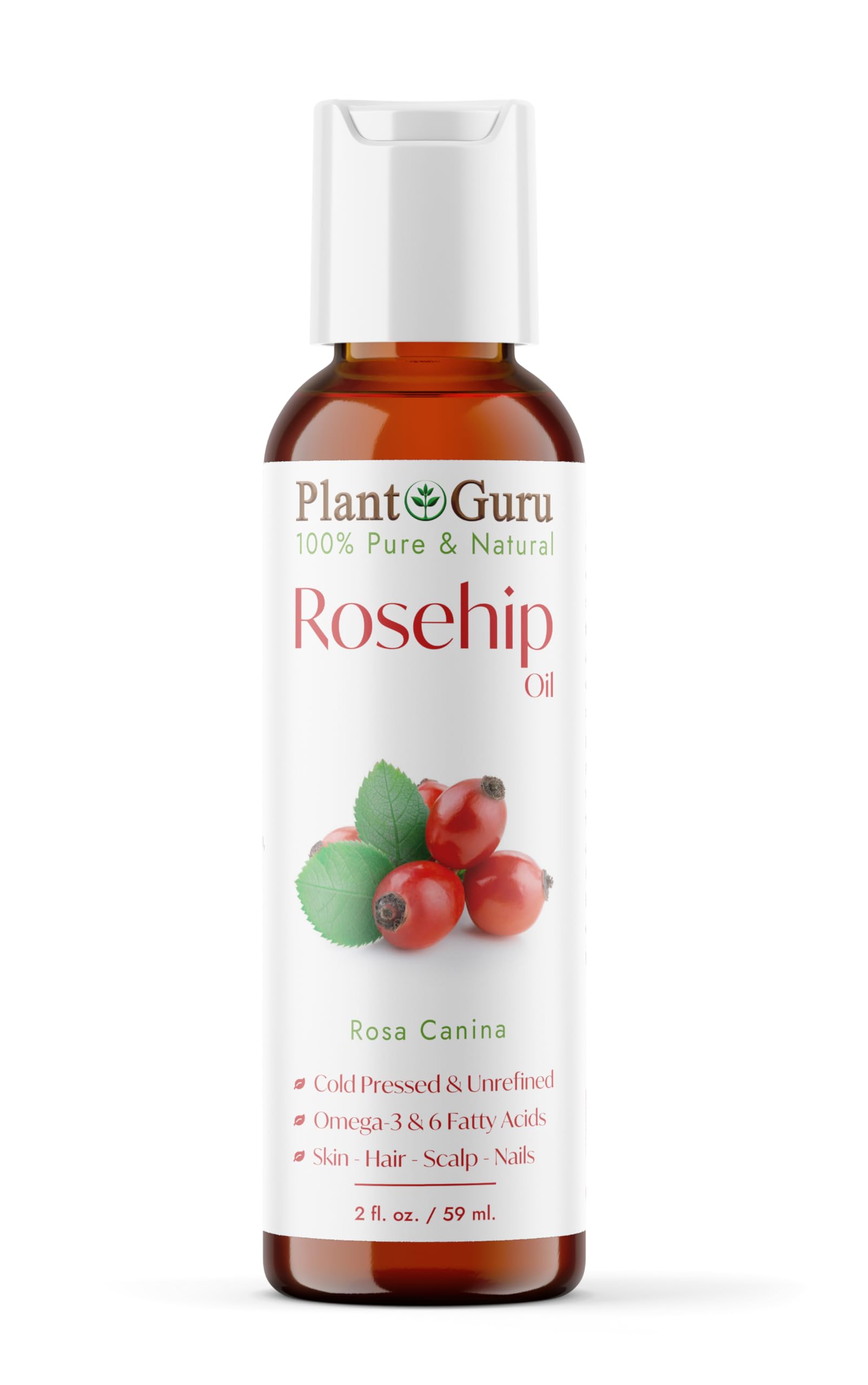 Plant Guru Rosehip Oil Unrefined 2 fl. oz. 100% Pure Cold Pressed Nourishing for Skin Hair Scalp and Nails Hydrating Moisturizing and Rejuvenating.
