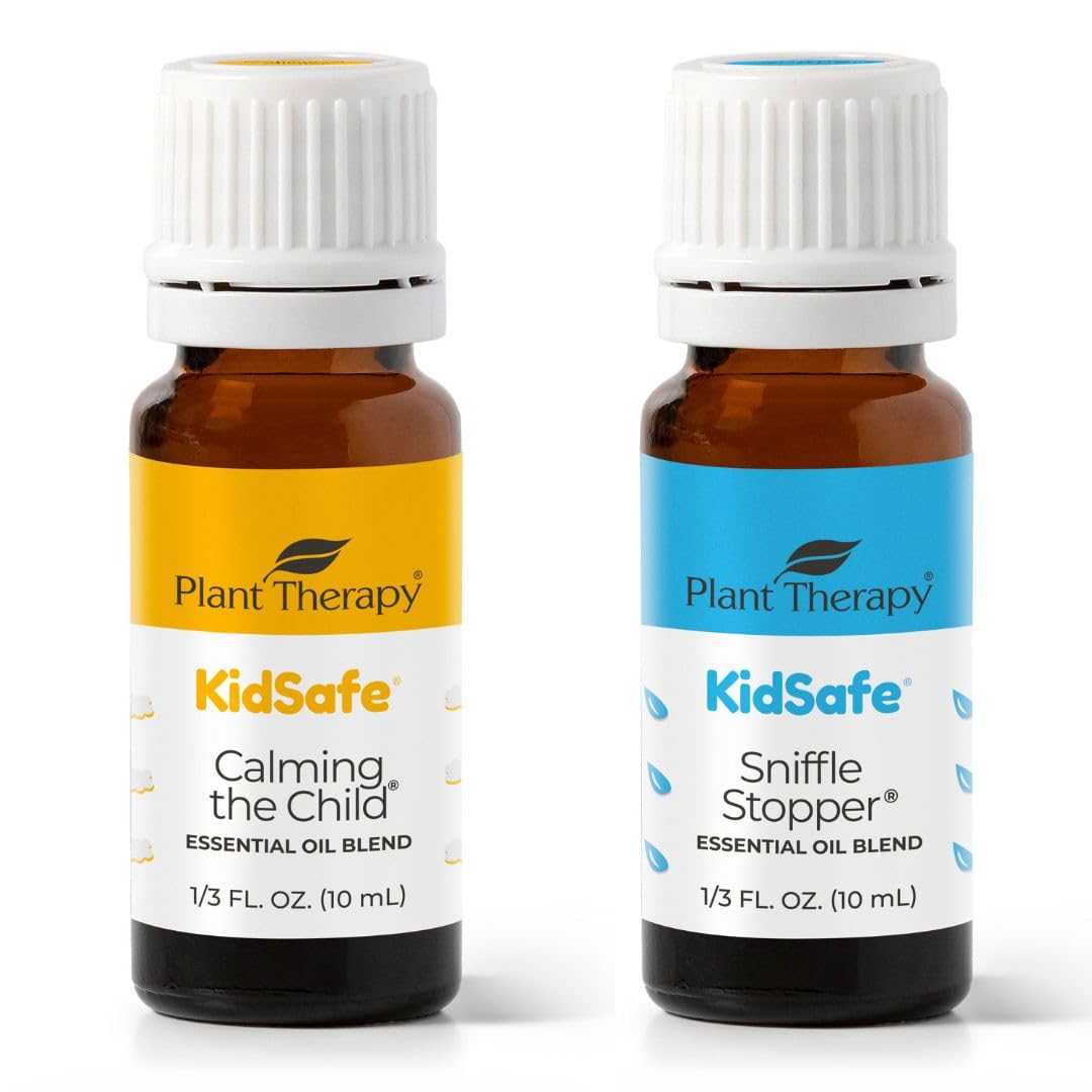HIGH-QUALITY AFFORDABLE ESSENTIAL OILS: At Plant Therapy our goal is to positively impact the lives of as many people as we possibly can, by selling such a high quality product at an affordable price. Be confident knowing you are purchg quality oils at direct-to-consumer prices. BATCH SPECIFIC GC-MS REPORTS ON EVERY OIL: Every bottle of oil from Plant Therapy goes through multiple rounds of testing including organoleptic testing and multiple rounds of GC-MS testing by several third-party laboratories. FORTIFY RESPIRATORY SYSTEM: Sniffle Stopper essential oil is a natural, organic blend of Fir Needle, Rosalina, Spruce Hemlock, Cypress, Spearmint, and Cedarwood Virginian. KidSafe Sniffle Stopper can help your child breathe easier, ease congestion, and provide sinus and allergy relief. 100 PURE OIL CRAFTED BY EXPERTS: Our Aromatherapists use only 100 Pure, undiluted essential oils. Put a few drops of this sweet smelling synergy blend in an aromatherapy diffuser or dilute it in your favorite Plant Therapy Carrier Oil and massage into your child's skin on their neck or chest. NATURAL SERENITY IN A HANDY BOTTLE: KidSafe Calming the Child essential oil is a blend of Mandarin Orange, Tangerine, Lavender, Roman Chamomile. It's a safe way to relax your child by calming the mind and bringing on a sense of tranquility. Great at bedtime to get a peaceful night's sleep.