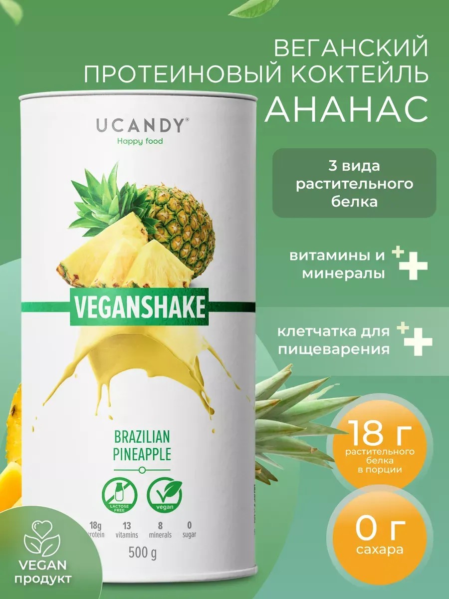 VEGANSHAKE - растительный вегетарианский протеин, протеиновый коктейль без сахара содержит более 70% белка и все питательные вещества, необходимые организму. В основе коктейля Veganshake - гороховый протеин без лактозы и только растительные белки. В составе гороховый изолят, а так же рисовый протеин и кoнo-пляный протеин. Полноценный источник белка для веган рациона. Veganshake - идеальное решение для всех, кто ведёт активный образ жизни в стиле Vegan. Протеин для вегетарианцев и веганов содержит все питательные вещества, необходимые организму. Белковый коктейль для похудения веган шейк UCANDY VEGANSHAKE содержит пониженное количество калорий, а пищевые волокна, входящие в состав коктейля для правильного питания, способствуют похудению, выводят из организма токсины, снижают скорость усвоения жиров. Содержит 22 витамина и минерала, полезные аминокислоты, которые укрепляют иммунитет и защитные силы организма. Можно использовать как для сушки и похудения так и набора мышечной массы. Подходит для приготовления низкокалорийной выпечки и полезных десертов. Благодаря правильному сочетанию компонентов, коктейль содержит все необходимые питательные вещества, витамины и аминокислоты. Veganshake - качественный и полезный перекус, в составе которого: высокое содержание белка растительного происхождения, 0 г сахара, клетчатка для пищеварения, комплекс витаминов и минералов. Не содержит глютен и лактозу! Оптимальное дополнение к основному рациону, заменяет вредные перекусы и восполняет дефицит калорий после тренировки. Коктейль для спортпита подойдет для профессиональных спортсменов, а также для людей увлекающиеся правильным питанием. Без ГМО, искусственных красителей и консервантов. Укрепляет иммунитет и системы организма. Быстро усваивается. Способ применения: Насыпать в шейкер 2 ложки, добавить 300-350 мл жидкости (воды, молока, сока) . Интенсивно взболтать не больше минуты. Готово!