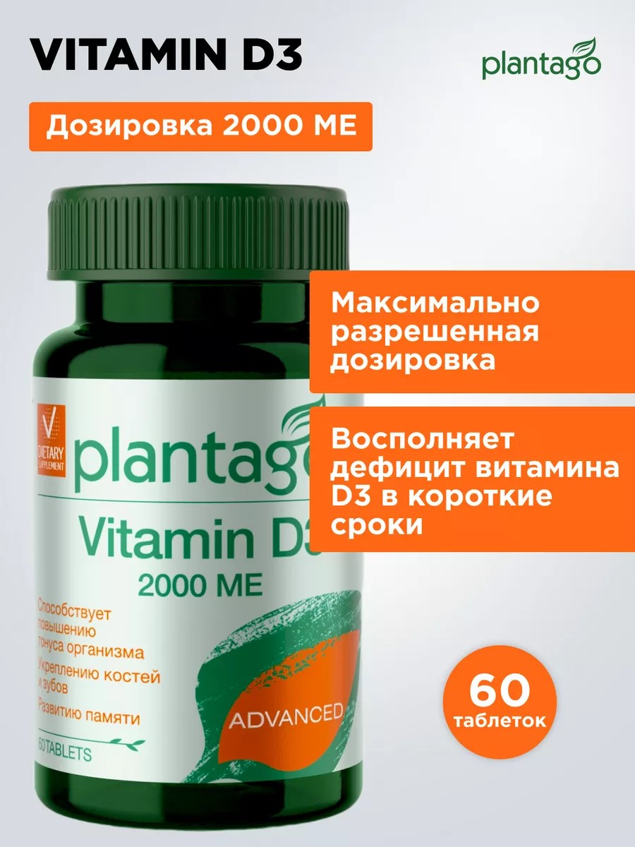 Plantago, Vitamin D3 2000 IU: Vitamin D3 (cholecalciferol) is essential for many metabolic processes. Vitamin D3 helps regulate the absorption of calcium and phosphorus, influencing bone metabolism, promoting the strengthening and improvement of bones and teeth, and reducing the risk of osteoporosis. Vitamin D3 stimulates the immune system, reducing the risk, severity, and duration of viral respiratory infections, as well as chronic inflammation; It helps maintain the reproductive function of men and women (in women - to maintain the functioning of the ovaries, conception and development of pregnancy; in men - for the normal functioning of the prostate (prevents the proliferation of prostate cells, which reduces the risk of prostate hyperplasia), to regulate testosterone levels (vitamin D interacts with receptors in cells that are responsible for the production of testosterone). An important function of vitamin D3 is to control the synthesis of serotonin - a neurotransmitter called the hormone of happiness, which affects, among other things, mood and well-being. People with normal levels of this vitamin are less likely to develop depression. Vitamin D3 helps improve memory, concentration and efficient brain function in general. Vitamin D3 also regulates metabolic processes in cells, maintains blood clotting, promotes better absorption of carbohydrates, increases the sensitivity of nerve fibers, and prevents the formation of cholesterol plaques. Vitamin D3 2000 IU Plantago contains 2000 IU - the most effective dosage for replenishing vitamin D3 deficiency in a short time Terms. This is the maximum permissible dosage permitted by the Russian Ministry of Health. It is a dietary supplement. It is not a medicine.