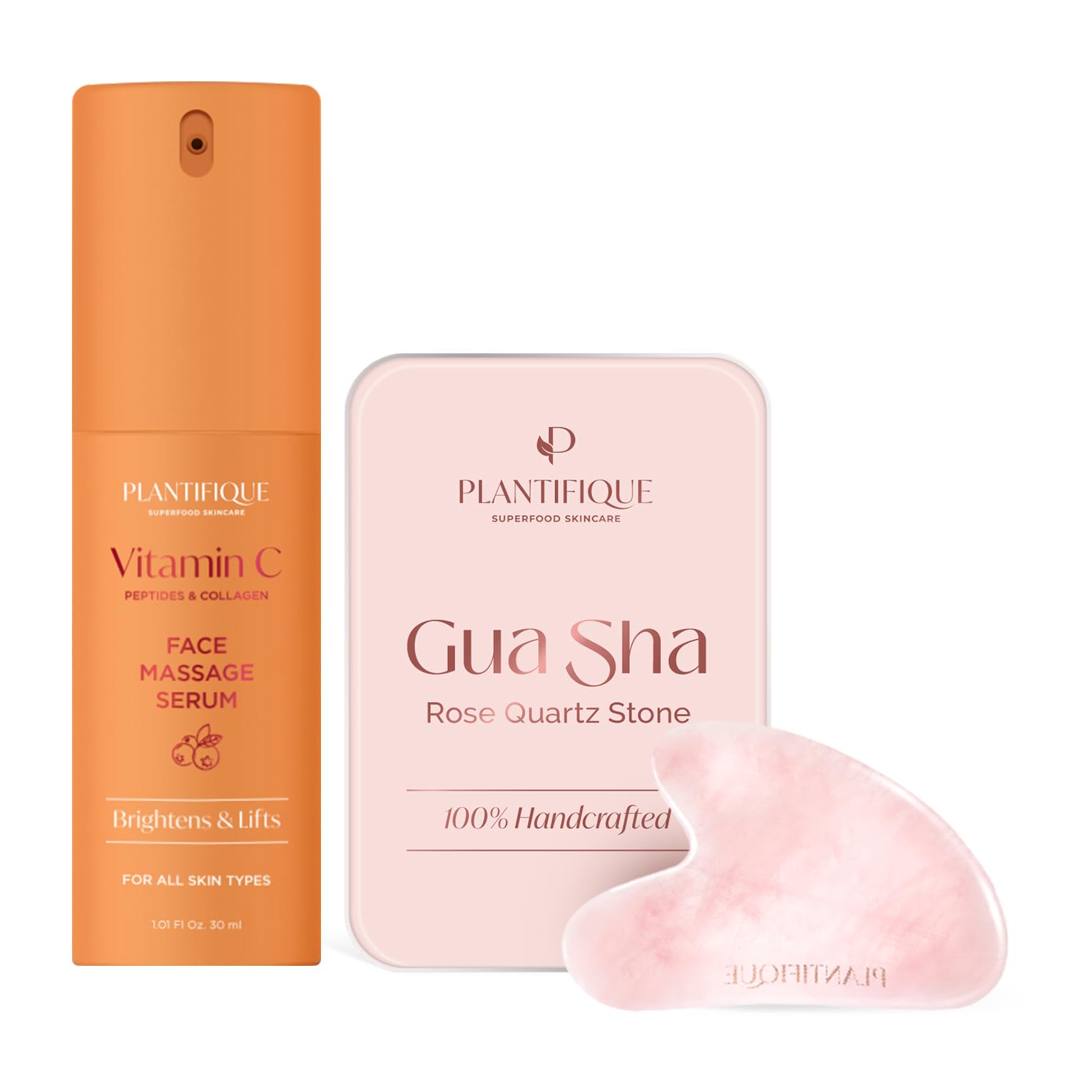 PLANTIFIQUE Gua Sha Visage et Corps en Pierre V ritable de Quartz Rose & S rum Visage Vitamine C - Serum Anti Tache Collagene - 30 ml