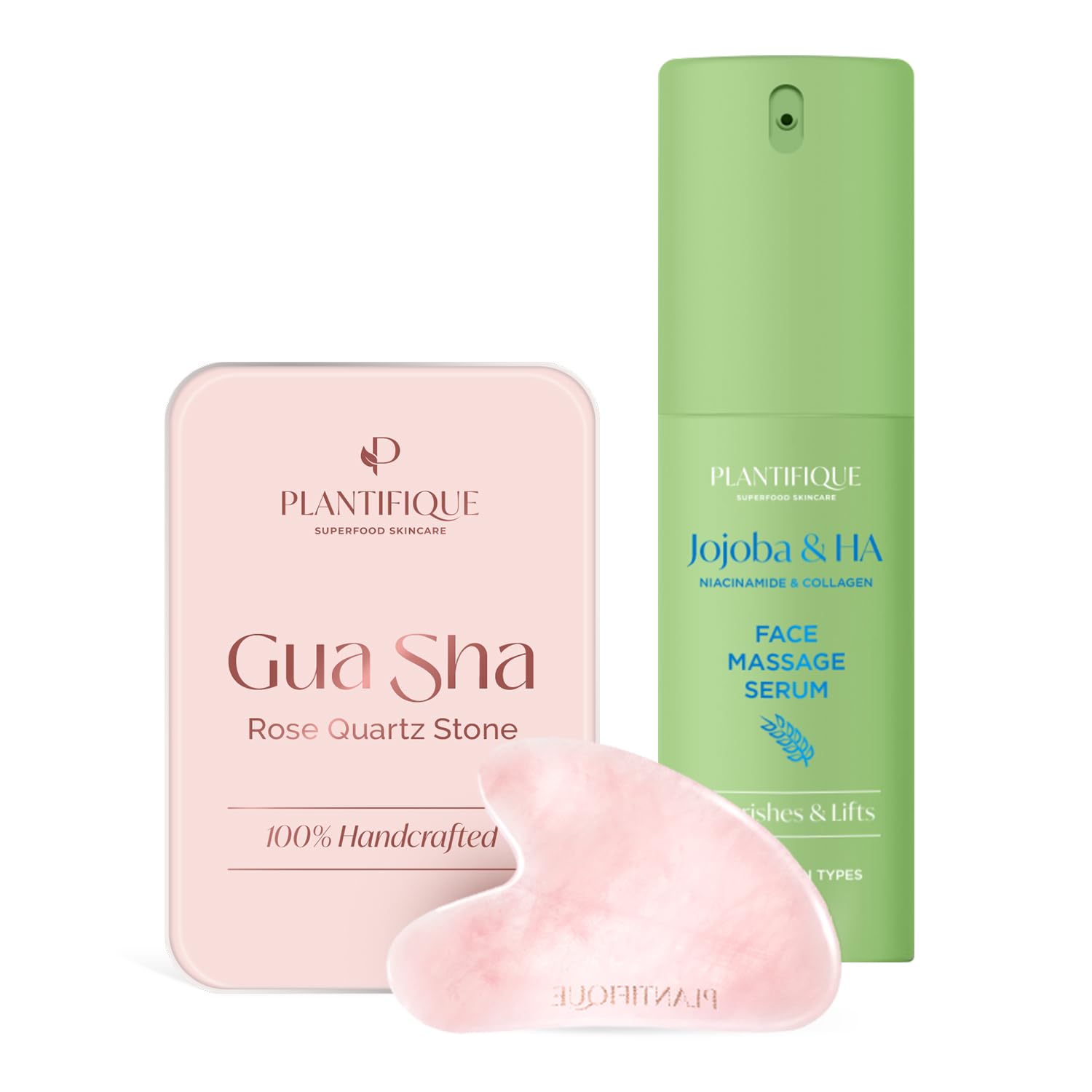 PLANTIFIQUE Jojoba Oil & Hyaluronic Acid Face Serum for Gua Sha Massage with Vitamin C E Niacinamide for Glowing Skin and Gua Sha Rose Quartz Tool for Face Anti Aging Massage