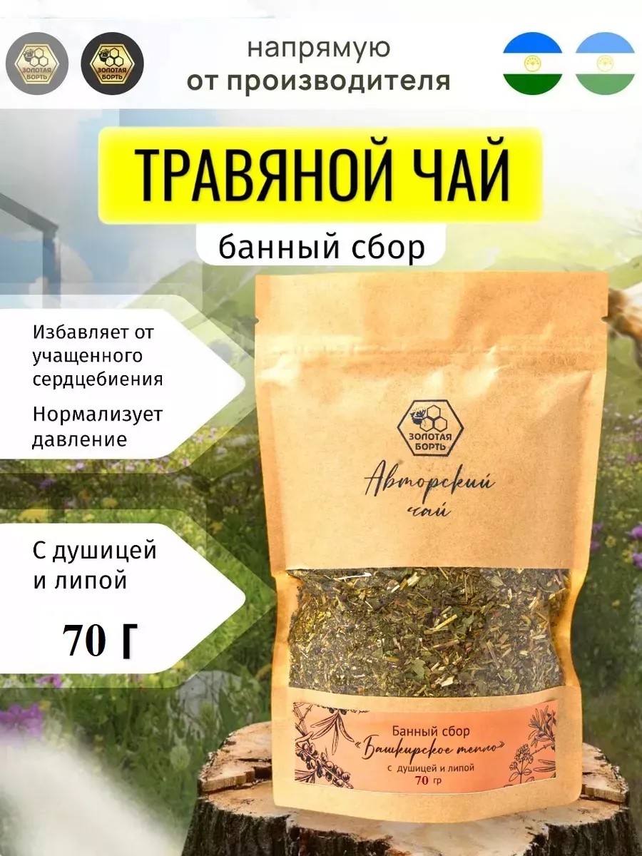 Сбор фиточай банный «Башкирское тепло» 80 г Золотая борть – это уникальный травяной банный сбор, созданный на основе натуральных ингредиентов собранных в лесах. В нашем чайном напитке соединены вместе лучшие травы! Напиток стабилизирует артериальное давление, избавляет от учащенного сердцебиения и головной боли,