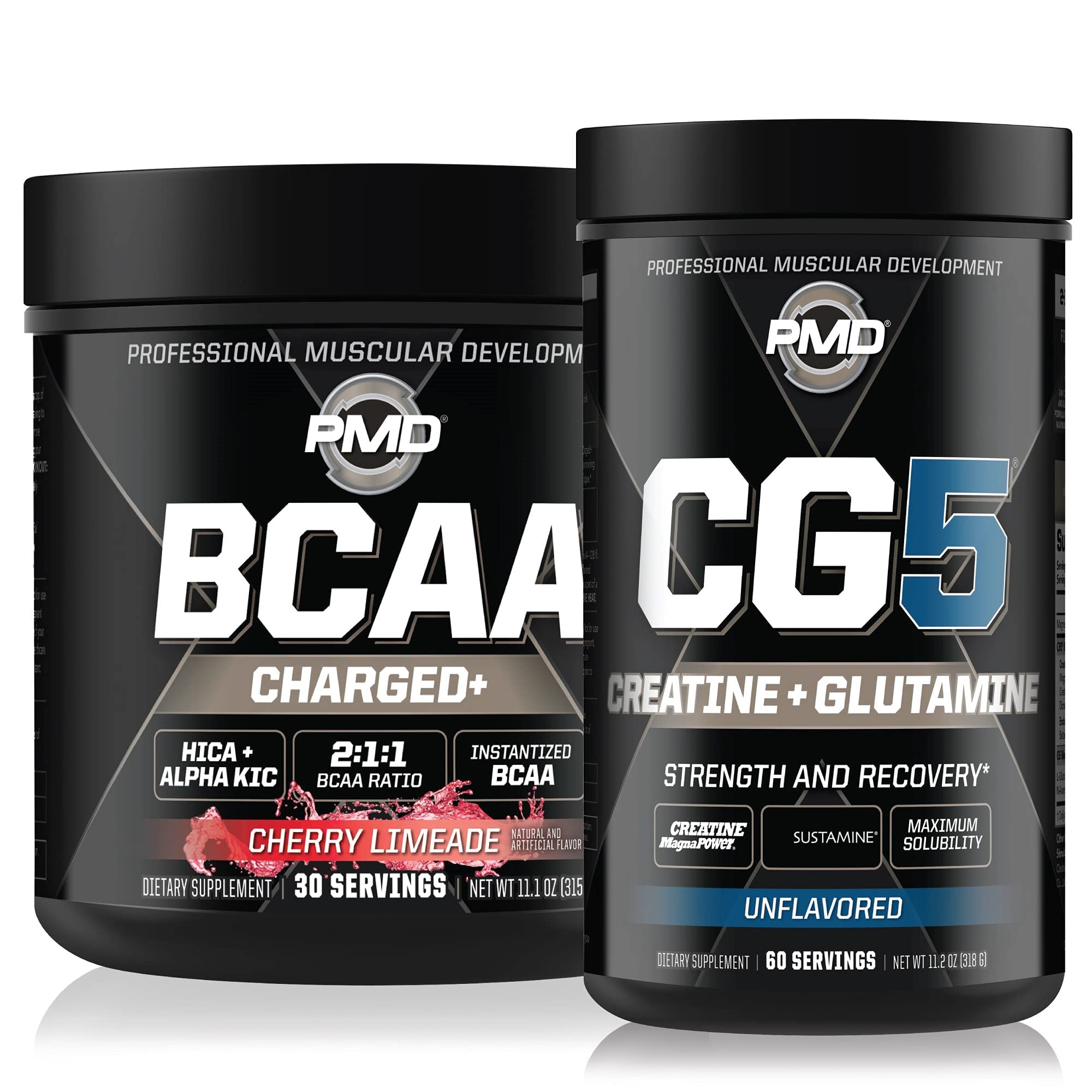When you want strength, recovery and overall muscle building results, creatine and glutamine should be at the top of your list! CG5 utilizes five advanced forms of creatine to ensure you are getting the absolute best in absorption and utilization without the need to load, or an uncomfortable bloat. The body uses glutamine as a cellular fuel for the immune system. It is also supported in the scientific community and by serious weightlifters that glutamine supplementation can minimize the breakdown of muscle tissue and help improve protein metabolism. By coupling these two sports nutrition essentials together, the result is CG5, is an unparalleled strength, performance and recovery formula geared to produce dynamic results! PMD's BCAA Charged innovative intra post-workout solution features 4 g of instantized BCAAs per serving (for better solubility). Also featured is a sequenced 2:1:1 (2- Leucine, 1 - Isoleucine, 1 – Valine) the preferred ratio to maximize performance. This ideal ratio offers an effective path to stimulate protein synthesis which results in muscle repair. And PMD's BCAA Charged includes two powerful ingredients in HICA (Alpha-Hydroxylsocaproic Acid) and Alpha KIC (Alpha Ketoisocaproate) for exceptional recovery. BCAA Charged has a strong and potent history of providing the means necessary to accelerate recovery times, support lean muscle mass, enhance endurance, and increase performance. Coupled with vitamin B-6 and B-12, PMD's BCAA Charged helps boost your energy levels so you can maximize your potential.Increased Energy: The Charged Complex features just the right amount of natural stimulant to help keep you energized at different points throughout the day. The smooth combination of caffeine anhydrous, green tea leaf extract, and green coffee bean extract helps to provide you with the right amount of energy without the jitters. Increased Strength: Included in this charged-up formula are two powerful ingredients: HICA (Alpha-Hydroxyisocaproic Acid) can help support lean muscle mass, helps you to train harder and longer, and helps reduce muscle soreness between workouts. Alpha KIC (Alpha Ketoisocaproate) helps to speed up muscle cell recovery, increases muscle strength, and reduces muscle damage during workouts. Enhanced Endurance: Besides the energy-generating creatine, CG5 contains 75 mg of Betaine Anhydrous to support and enhance endurance. Betaine Anhydrous also promotes an increase in nitric oxide production. Nitric oxide is involved in many cell processes, including the widening of the blood vessels, or vasodilation. Wider blood vessels help increase the delivery of nutrients and oxygen to working muscles during exercise, thus enhancing exercise performance. Powerful Strength: CG5 features a blend of 5 different forms of Creatine, and is specifically formulated without creatine monohydrate. It does, however, include clinically studied Creatine MagnaPower, an advanced form of creatine that binds creatine to magnesium, making it less susceptible to breakdown in the stomach. By including MagnaPower, CG5 helps to maximize overall creatine uptake into the body. Pre And Post Workout: Prep for your workout by getting the energy and endurance that you need. After your workout, get the recovery that you need to get back to the gym. With creatine and glutamine, you'll take your lifts to the next level.