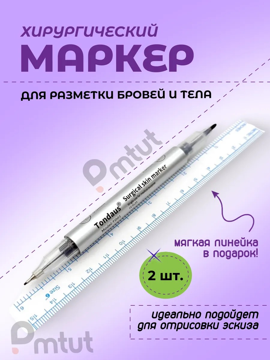 Хирургический стойкий двухсторонний маркер для отрисовки эскиза с линейкой для татуажа, перманентного макияжа бровей и губ. Толщина линии 0,5 мм и 1 мм.