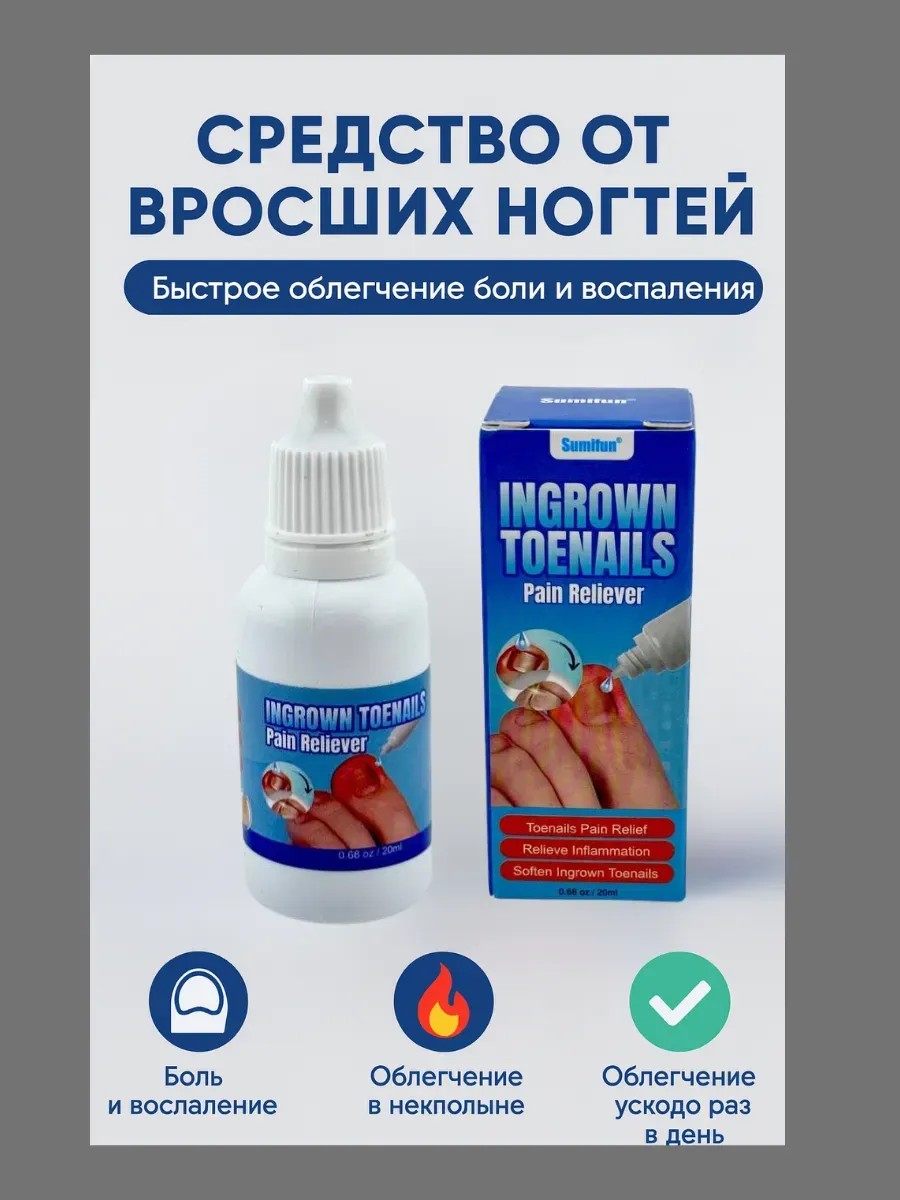 Средство от вросших ногтей Жидкость создана специально для ухода за ногтями и кожей стоп, склонных к вросшим ногтям, воспалениям и раздражениям. Благодаря натуральным растительным экстрактам и антисептическим компонентам средство помогает быстро снять боль, смягчить ногтевую пластину и предотвратить развитие микробов.