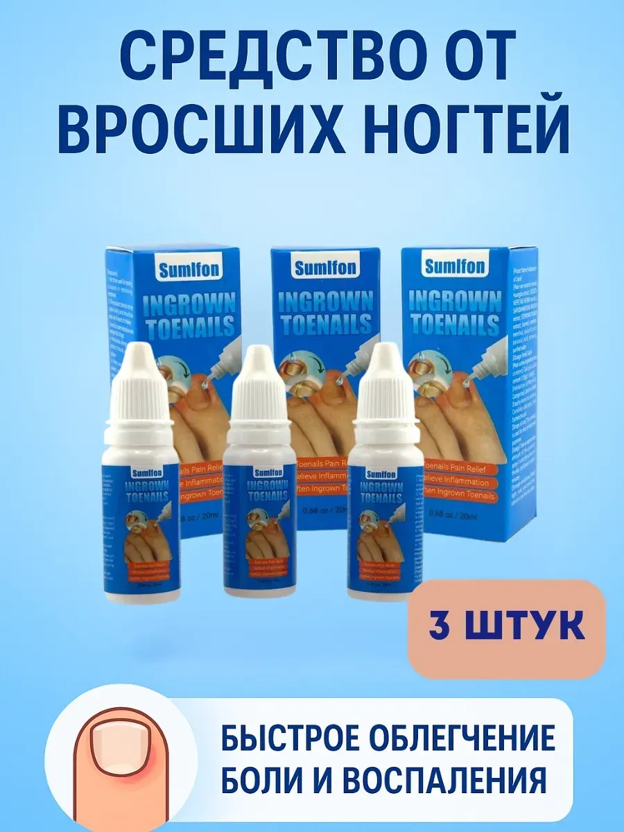 Средство от вросших ногтей 3 штук Жидкость создана специально для ухода за ногтями и кожей стоп, склонных к вросшим ногтям, воспалениям и раздражениям. Благодаря натуральным растительным экстрактам и антисептическим компонентам средство помогает быстро снять боль, смягчить ногтевую пластину и предотвратить развитие микробов.