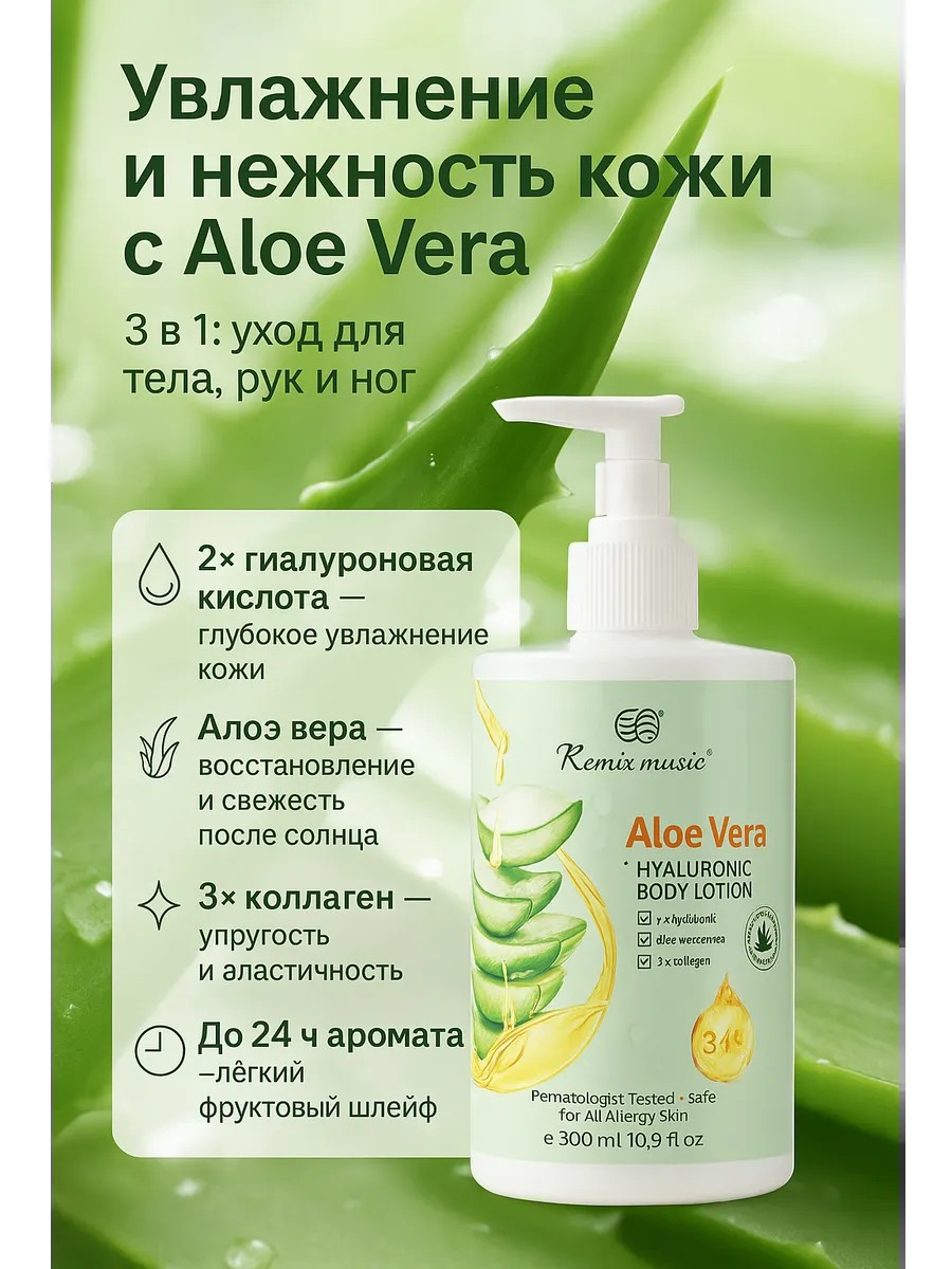Увлажняющий лосьон для тела с алоэ вера и гиалуроновой кислотой — это универсальное уходовое средство, которое подходит для ежедневного применения и бережного ухода за кожей всех типов. Благодаря легкой текстуре молочко для тела быстро впитывается, не оставляя липкости, и обеспечивает ощущение мягкости и бархатистости на протяжении всего дня.