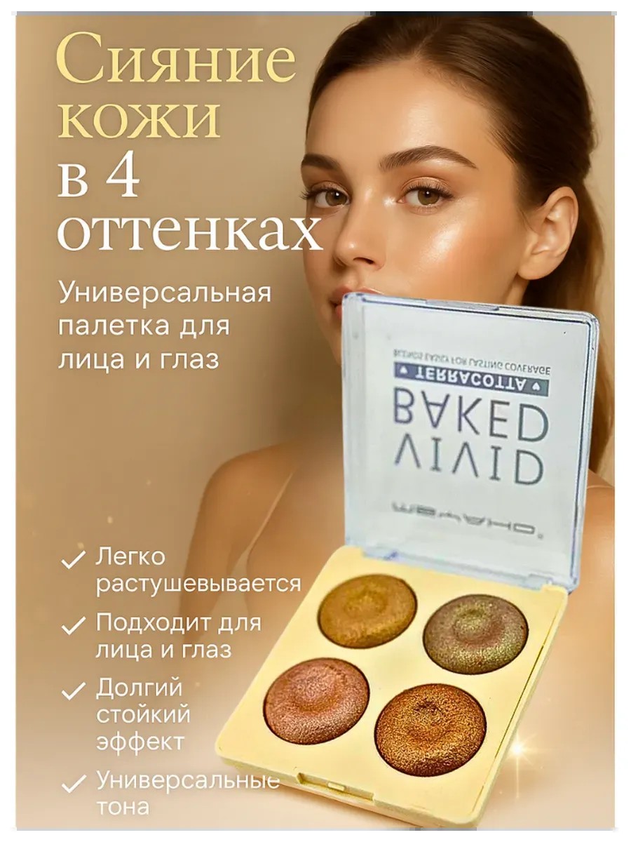 Запечённый хайлайтер для лица в удобной палетке из 4 универсальных оттенков — это незаменимый элемент в косметичке каждой женщины, которая хочет подчеркнуть красоту и придать коже естественное сияние.