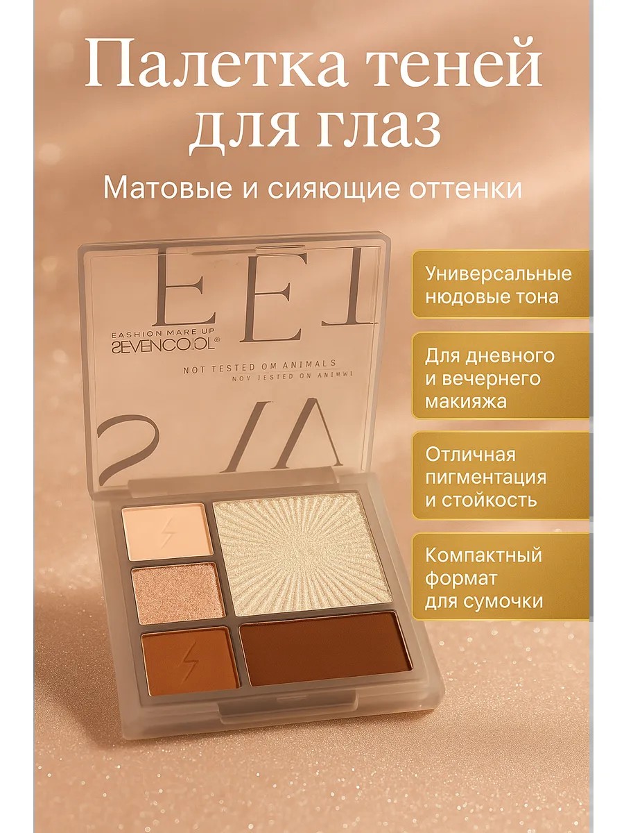Нежный матовый бежевый оттенок идеально подходит для основы, помогает выровнять тон века и создаёт мягкий фон для дальнейшего макияжа. Перламутровый розово-золотистый шиммер добавляет сияние и лёгкий блеск, делая образ более свежим и утончённым. Сияющий хайлайтер с выраженной фактурой прекрасно подходит для акцентов — внутренний уголок глаза, зона под бровью или даже как дополнительный штрих в вечернем макияже. Два матовых коричневых оттенка — универсальные помощники для создания глубины, мягкой растушёвки или подчёркивания линии ресниц.