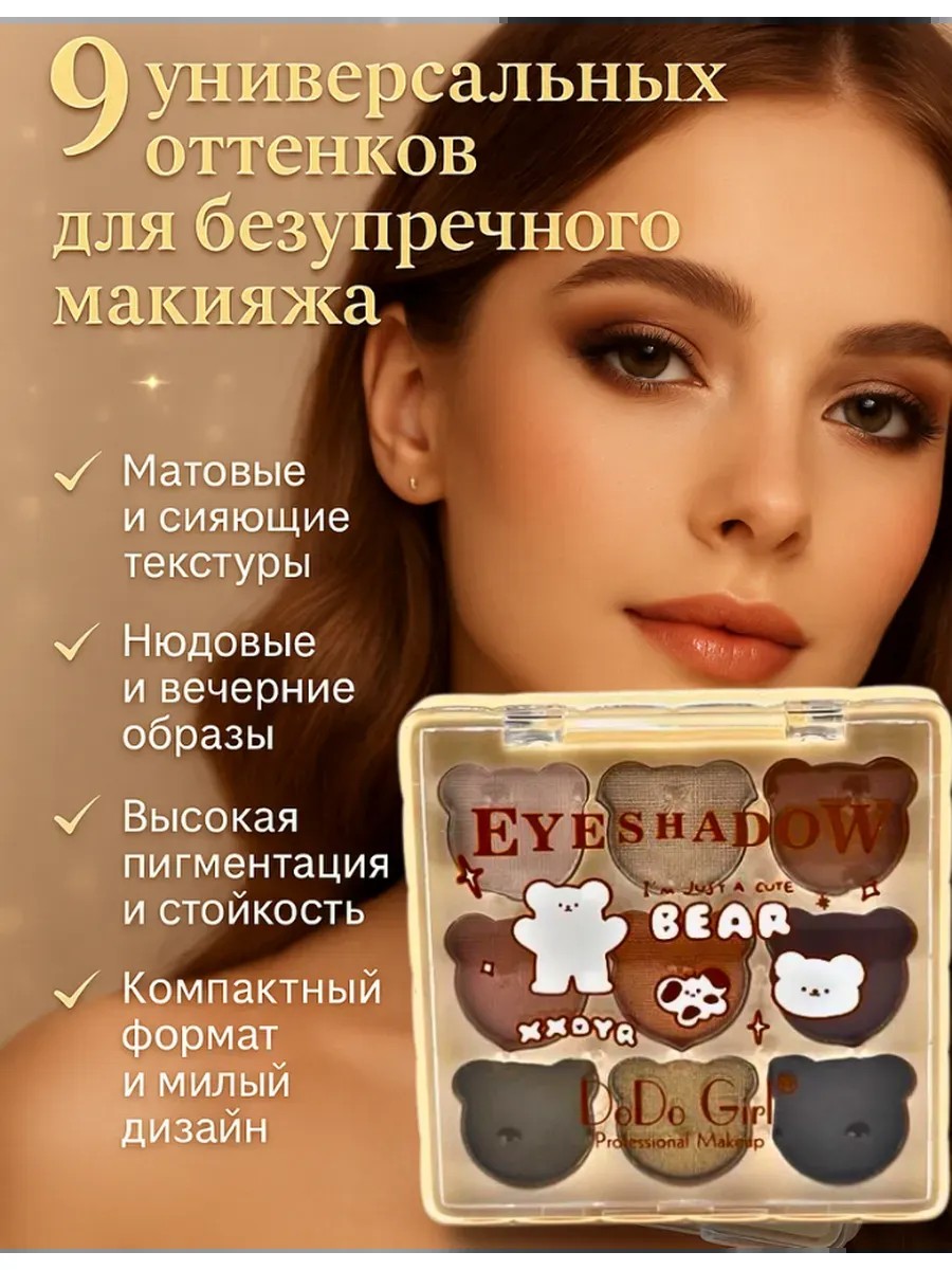This eyeshadow palette in a cute "teddy bear" design is perfect for those who love combining vibrant makeup with convenience and practicality. Its compact case contains nine versatile shades, allowing you to easily create both a delicate daytime look and a dramatic evening makeup look.