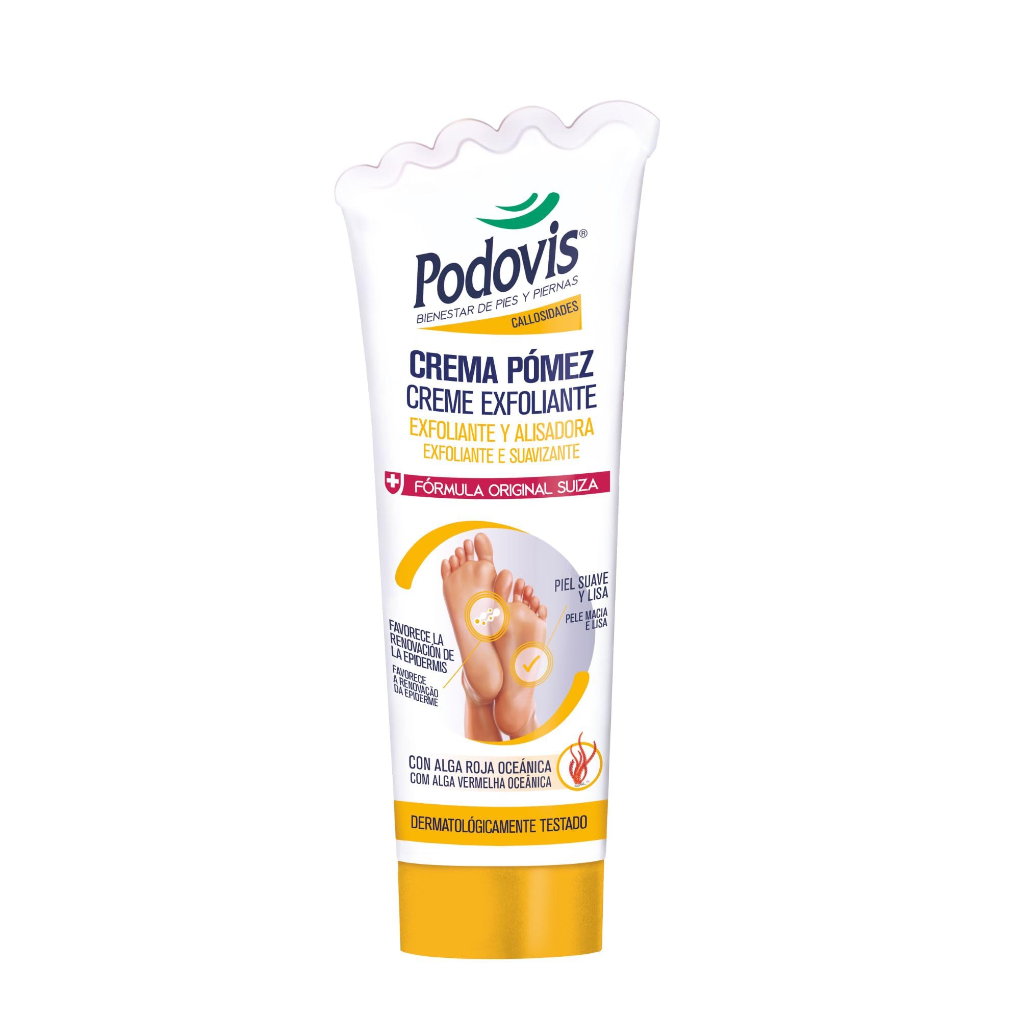 Podovis Pumice Cream, with its intensive exfoliating action, effectively removes dead skin cells from the feet from the first application, promoting skin renewal. Thanks to the presence of pumice microgranules, it facilitates the gradual reduction of calluses and hardened skin. Also suitable for diabetic feet. The special formula, enriched with wheat germ oil, leaves the skin noticeably softer and smoother. The addition of menthol also guarantees a pleasant feeling of freshness and well-being. Laboratory tests show that regular use of the cream helps maintain skin hydration and prevent peeling. The product was tested on diabetic subjects (28 subjects treated for 2 months at the Diabetic Foot Center). Podovis products are approved by the Italian Society of Sports Podiatry. Dermatologically tested.