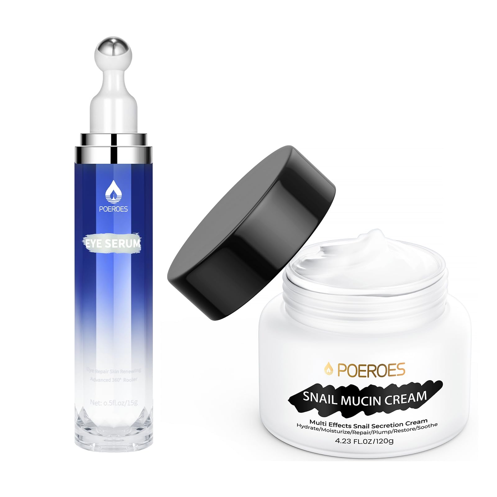 Poeroes Comprehensive Skin Care Set Experience a transformative skincare routine with the Poeroes Comprehensive Skin Care Set, featuring our signature Eye Serum and Snail Mucin Cream, meticulously designed to rejuvenate and hydrate your skin. Eye Serum with 8 Caffeine Formula: Targeted Eye Care: Our powerful eye serum, enriched with 8 caffeine, 8 retinol, hyaluronic acid, niacinamide, and peptides, works to diminish puffiness, dark circles, fine lines, and wrinkles around the eyes. 360-Degree Massage Ball: The included 360-degree eye roller massage ball enhances circulation and drainage, leaving your eyes looking brighter and more awake. Squeeze-to-Release Application: Simply press and squeeze the serum liquid for application, ensuring a controlled and hygienic dose each time. Comfortable Daily Use:The lightweight cream formula absorbs quickly, allowing for comfortable daily use under or over eye makeup. Persistent Results: Regular use firms and tightens the delicate under eye skin over time. Most users notice significant effects after one month, with improved results with consistent use and good night's sleep. Snail Mucin Cream with 99.3 Snail Secretion Filtrate: Long-Lasting Hydration:Infused with 99.3 Snail Secretion Filtrate, this cream creates a moisture barrier, plumping and soothing the skin for a radiant appearance. Key Moisturizing Ingredient: The "Mucin" in Snail Secretion Filtrate is a powerhouse for enhanced moisturization, soothing damaged skin and delivering moisture deep into the skin. Environmentally Friendly Extraction:Our snail mucin is harvested in a manner that respects the snails' natural habitat, ensuring no harm is done to these creatures. Hypoallergenic and Cruelty-Free: Formulated without harsh chemicals, this cream is safe for sensitive skin and suitable for all skin types. Poeroes is committed to cruelty-free practices. Poeroes Quality Standards:This hypoallergenic, dermatologist-tested cream is free from parabens, sulfates, and phPoeroes Quality Promise: Cruelty-free and gentle skincare products, ensuring snail-friendly and eco-conscious choices. Consistent Skincare Regimen: Regular use leads to visible results with a focus on sleep for enhanced absorption. Sensitive Skin Safe: Both are free from harsh chemicals, ideal for sensitive skin with no parabens or sulfates. Hydrating Snail Mucin Cream: This face cream with 99.3 snail mucin offers long-lasting moisture for all skin types. Powerful Eye cream: The 8 caffeine eye serum combats puffiness and fine lines, paired with a massage ball for vibrant eyes.