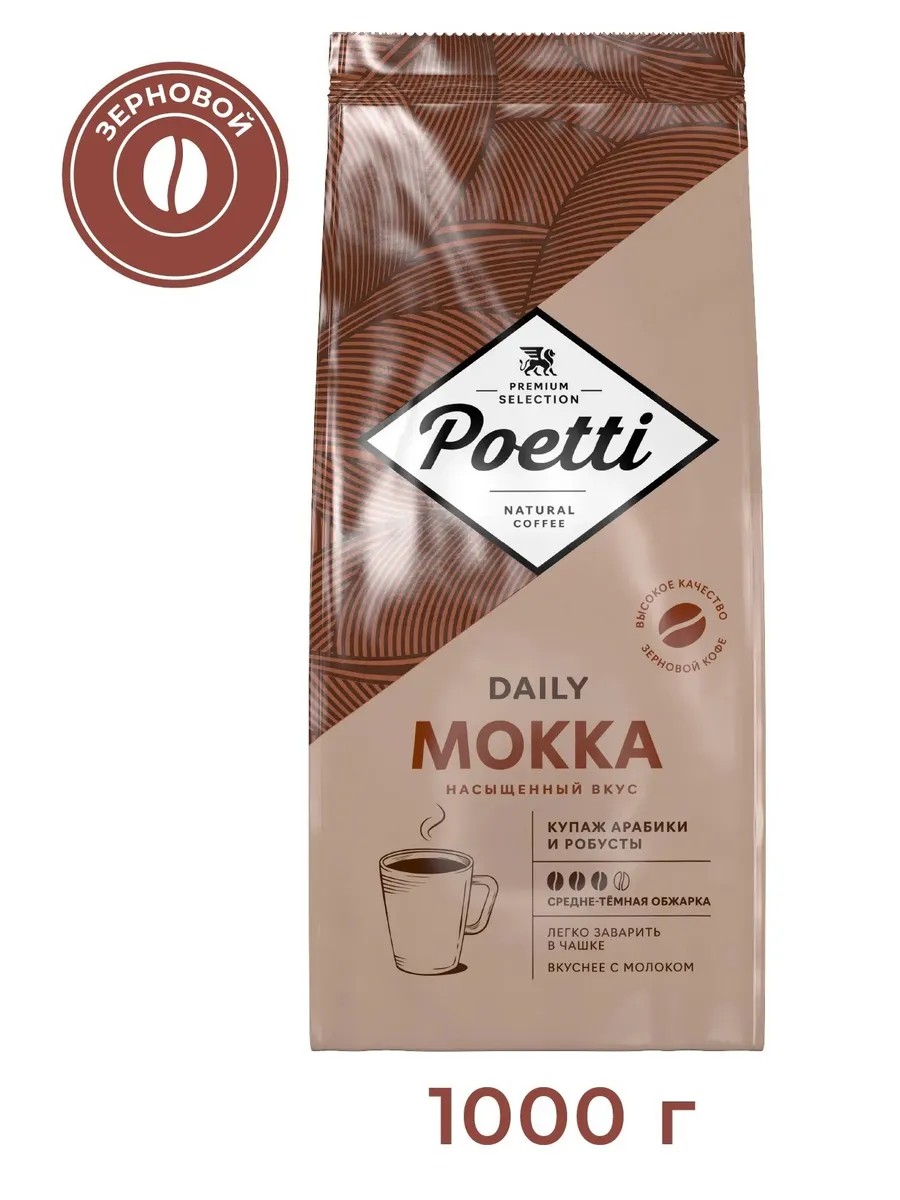 Поетти Дэйли Мокка - смесь зёрен арабики и робусты. Средне-темная обжарка зерна обеспечивает высокую плотность напитка. Этот кофе имеет насыщенный вкус с нотами горького шоколада и орехов.