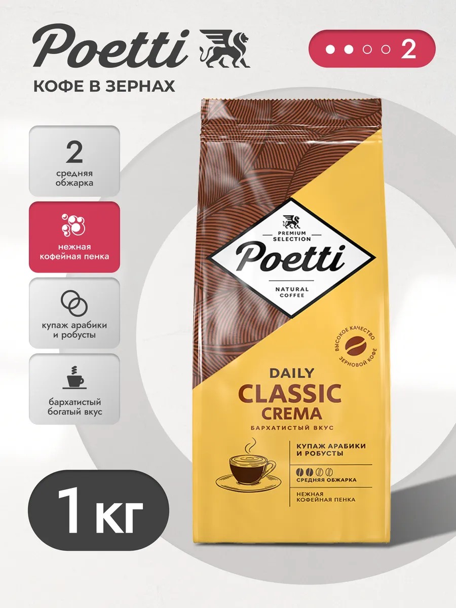 Кофе зерновой 1 кг арабика 100% Poetti Daily Classic Crema- Бархатистый мягкий вкус с нотами шоколада и орехового пралине. Идеально подходит для приготовления в турке, френч-прессе, гейзерных кофеварках и кофемашинах.
