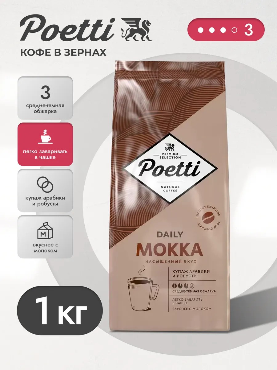 Кофе зерновой 1 кг арабика 100% Poetti Daily Classic Crema- Бархатистый мягкий вкус с нотами шоколада и орехового пралине. Идеально подходит для приготовления в турке, френч-прессе, гейзерных кофеварках и кофемашинах.