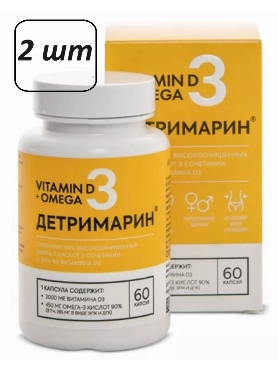 Детримарин – биологически активная добавка (БАД) к пище - капсулы, содержащие в своем составе жир океанических рыб и витамин D3. Данное сочетание укрепляет иммунитет, улучшает обмен веществ, положительно влияет на здоровье костной ткани, кожи, ногтей и волос. Витамин D - жизненно важный жирорастворимый витамин, необходимый для нормальной работы практически всех органов и систем человеческого организма. Эйкозапентаеновая (ЭПК) и докозагексаеновая (ДГК) кислоты, относящиеся к незаменимым омега-3 полиненасыщенным жирным кислотам, являются ключевыми структурными компонентами мембран клеток, поэтому их регулярное поступление необходимо для эффективной работы большинства органов систем нашего организма. Рекомендуется принимать взрослым по 1 капсуле 1 раз в день во время еды. Продолжительность приема - 1 месяц. При необходимости прием можно повторить. Детримарин – это отличное дополнение к здоровому образу жизни и балансированному питанию.