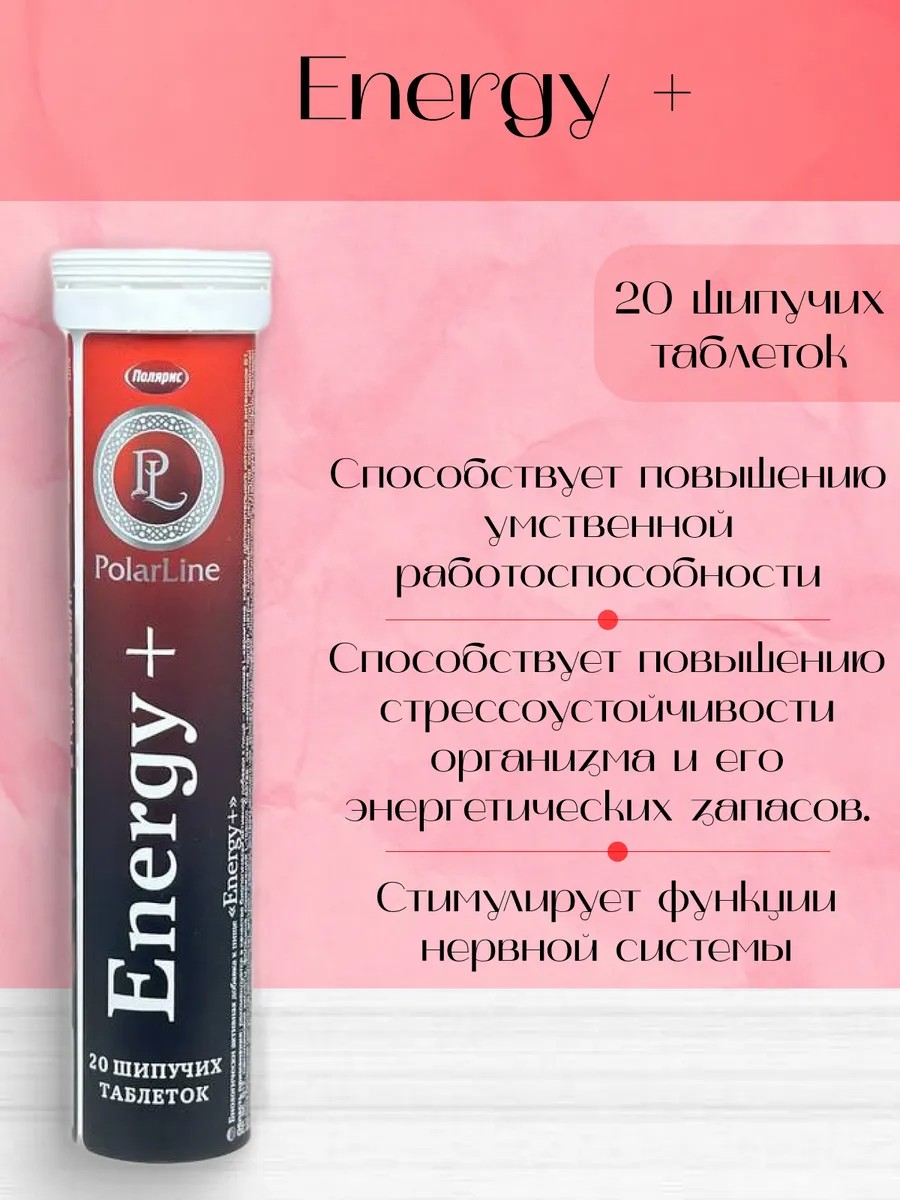 "Energy+" ТМ PolarLine - комплекс 6 витаминов, кофеина, L-карнитина и L-теанина, специально предназначен для повышения физических и интеллектуальных сил, а также для усиления концентрации и внимания, оказывающий стимулирующее действие.
