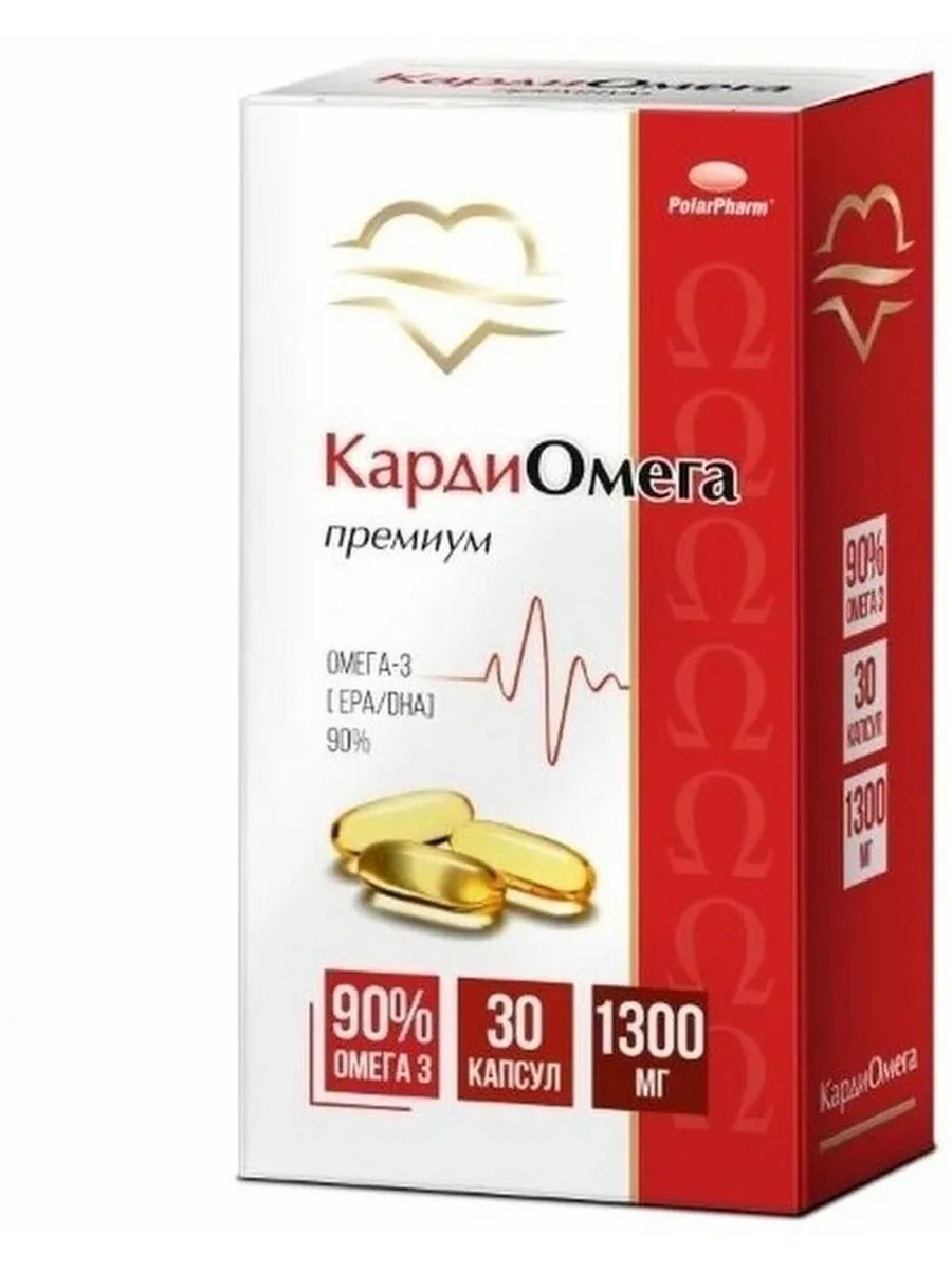 Omega-3 капсулы, являются ценным источником незаменимых жирных кислот для поддержания здоровья сердечно-сосудистой и нервной системы. В каждой капсуле находится 1300 мг омега-3-жирных кислот, включая 600 мг эйкозапентаеновой (EPA) и 400 мг докозагексаеновой (DHA) кислот. Данный продукт помогает укрепить иммунитет, улучшить память, концентрацию и зрение, снизить уровень холестерина и кровяного давления. Удобная форма капсул облегчает использование продукта в любом месте и в любое время. Омега-3 капсулы являются безопасным и естественным средством ухода за здоровьем и поддержания организма в отличной форме. Прием одной капсулы «КардиОмега» Премиум обеспечивает оптимальную суточную потребность человека в Омега-3.