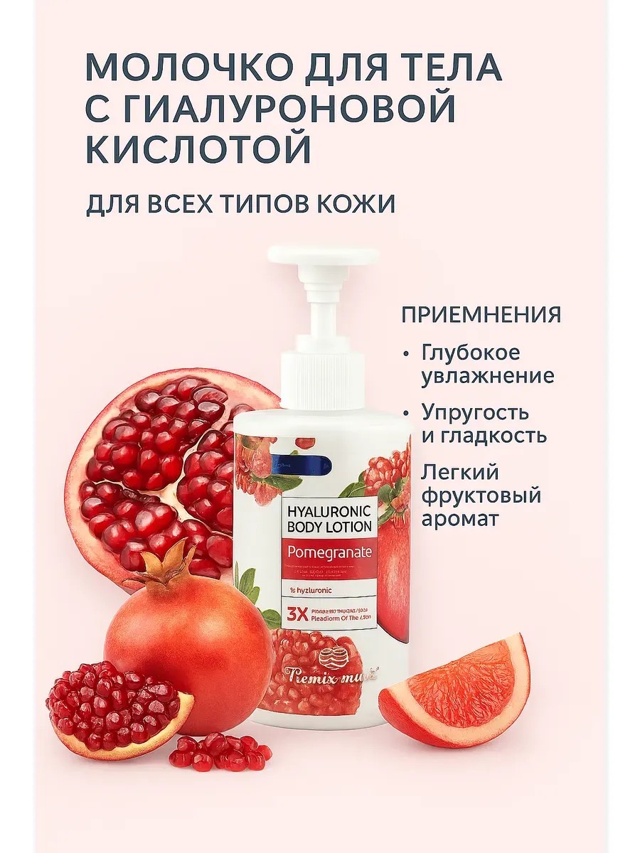 Побалуйте свою кожу с увлажняющим лосьоном для тела на основе гиалуроновой кислоты и натурального гранатового экстракта. Это универсальное средство обеспечивает комплексный уход за телом, руками и ногами, глубоко питая и смягчая кожу.