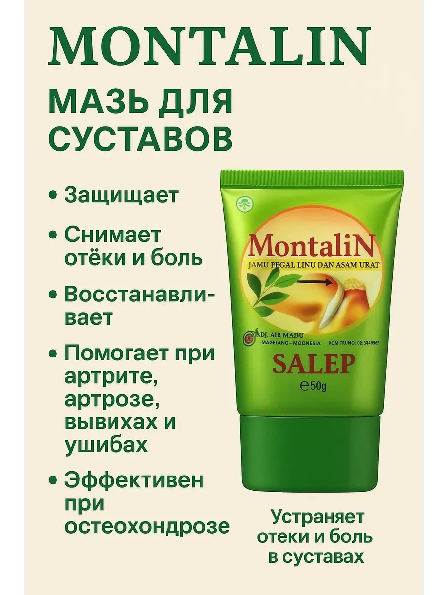 Ищете эффективное средство от боли в суставах, мышцах, пояснице или спине? Попробуйте Montalin Salep — уникальную индонезийскую мазь на травах, созданную по традиционной рецептуре для снятия воспаления, отёков и устранения неприятных ощущений в теле.