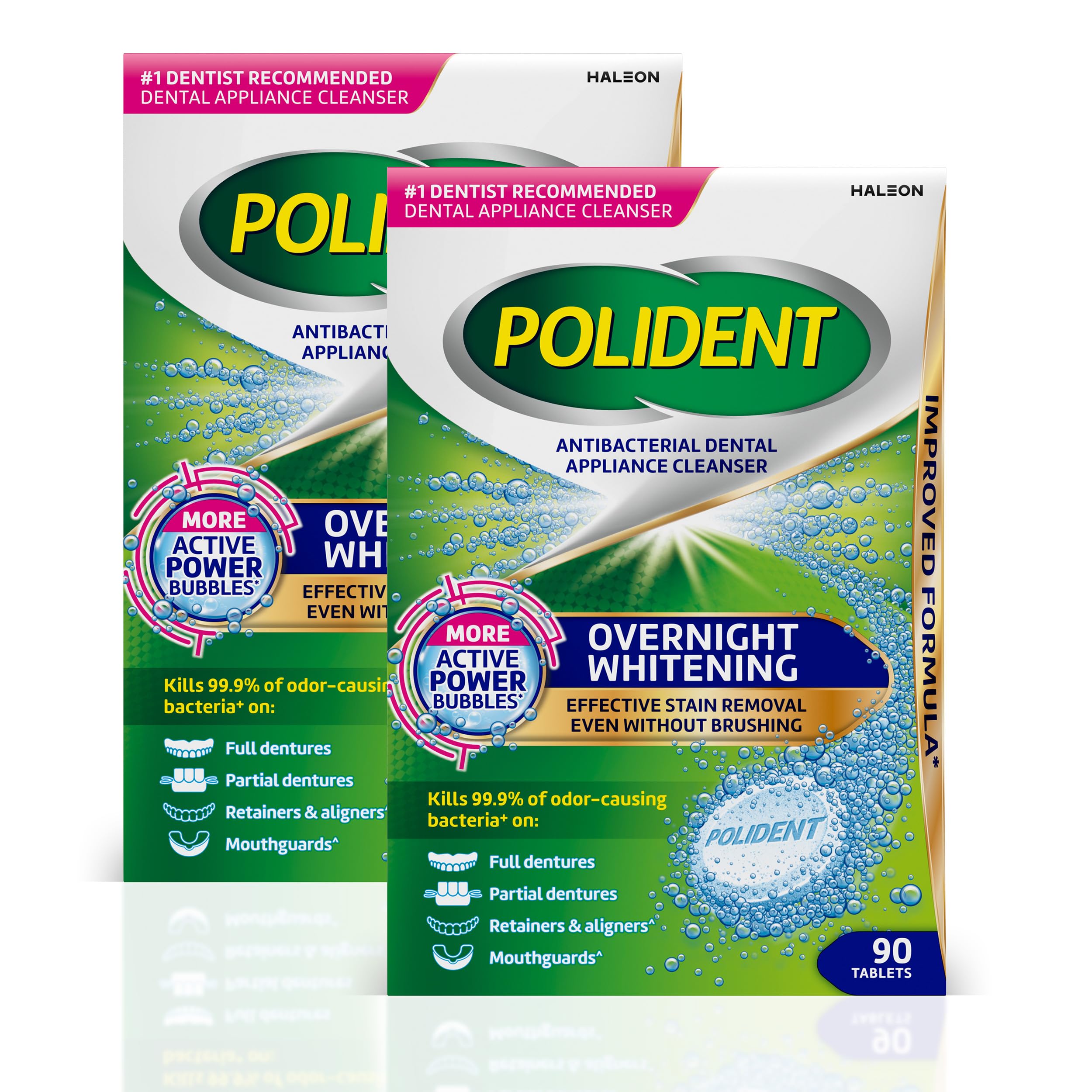 Active power bubbles are tough on dirt but gentle on your dental appliance for a 360-degree deep clean (4). These denture cleaning tablets are specially designed formula for dental appliances including full dentures, partial dentures, retainers, aligners, and mouthguards (3). Our denture cleaner delivers effective stain removal without brushing. This retainer cleaner (3) kills 99.9 of odor-causing bacteria (2) and keeps your dental appliance fresher for longer (5). New improved formula (1) with more active power bubbles (1) that clean even the hardest to reach places (2). Two 90 count boxes of Polident Overnight Whitening Antibacterial Dental Appliance Cleanser Tablets.