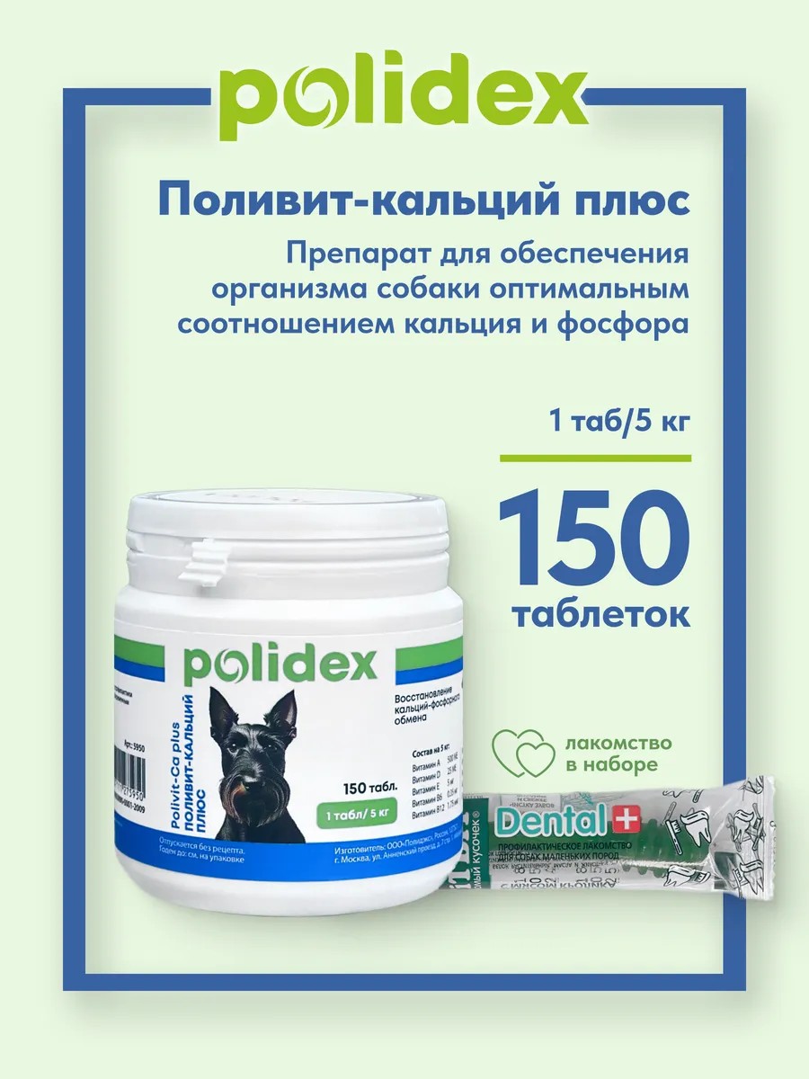| Комплектация | Витамины для собак и щенков Polidex Polivit Ca Plus 150 таблеток |