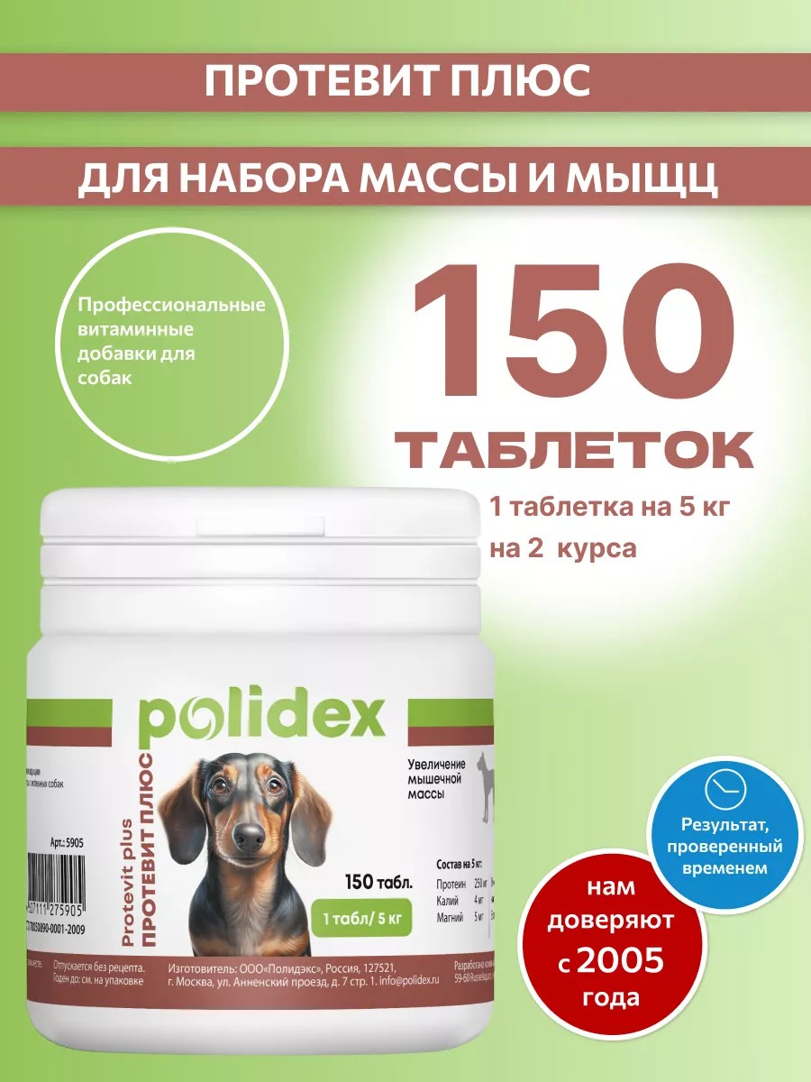 Витамины для собак Polidex Protevit plus. обратите внимание : В карточке товара можно выбрать одну из трех дозировок: 1 таблетка на 5 кг веса собаки, 60 таблеток в упаковке, 1 таблетка на 5 кг веса собаки, 150 таблеток в упаковке и 1 таблетка на 10 кг веса, 300 таблеток в упаковке. Выбирая дозировку ориентируйтесь на вес своей собаки. Полидекс Протевит плюс - это витамины для набора веса, для роста мышечной массы у собак, для улучшения кондиции в период выставок, для реабилитации истощенных животных и для собак с высокими физическими нагрузками, для повышения работоспособности и выносливости. Витамины для собак для мышечной массы Polidex Protevit восполняют недостаток мышечной массы у истощенных животных. Повышает работоспособность и выносливость собак. Сокращают фазу отдыха после нагрузок. Способствует улучшению внешнего вида. В состав препарата входят протеин, стимулятор белкового обмена, способствующий усвоению и поступлению протеина в мышечную ткань, витамины, аминокислоты, макро и микроэлементы. Подходят для крупных пород, для средних пород, для мелких пород. Витамины для собак для мышечной массы. Витамины для собак протеин. Таблетки для роста мышц.