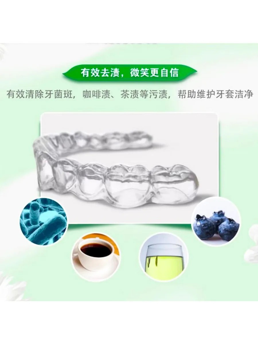 Usage: Dissolve the tablet in water, immerse the denture or aligner for 5 minutes, then rinse.