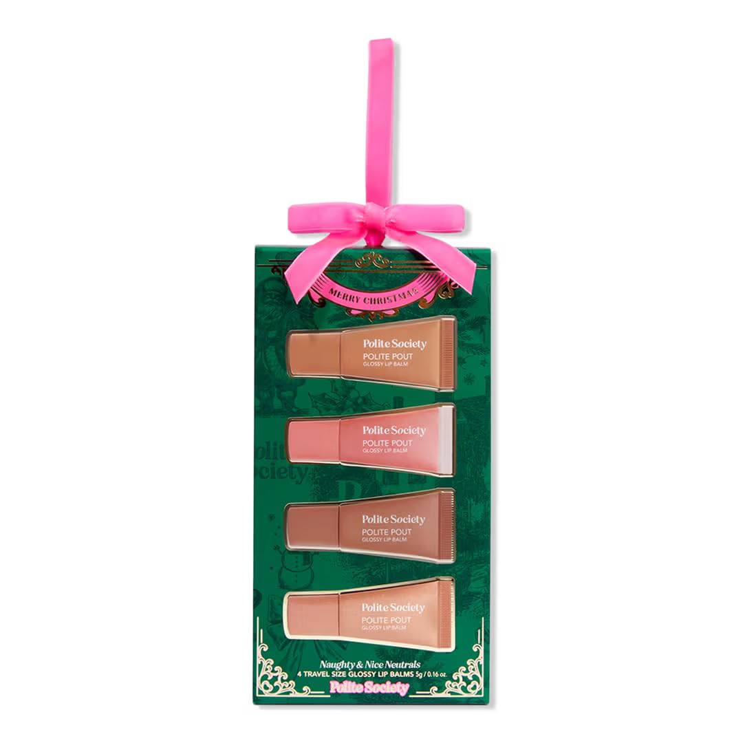 Polite Society's Naughty Nice Neutrals includes their bestselling glossy lip balms in 4 travel size neutrals—one fan-favorite shade and three brand new exclusive Christmas shades.