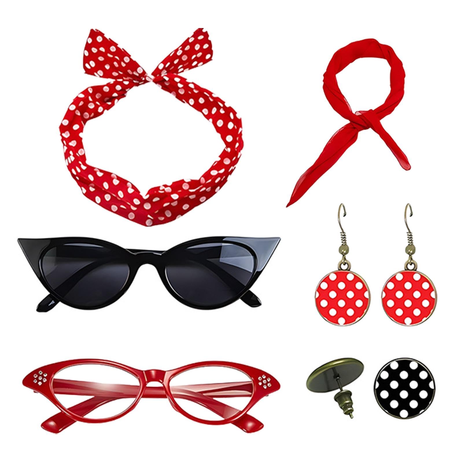 Polka Dot Headband - Drop Earrings Headbands 1950s Outfi Set Vintage Polka Dot Hair Bands with Chiffon Scarf Eye Glasses for Girls Red One Size